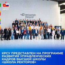 Проректоры Кыргызско-Российского Славянского университета — Евгений Шекунов, Елена Аверкова и Станислав Куликов — а также руководитель аппарата ректората Юлия Калюжная участвуют в образовательной программе «Школа ректоров», реализуемой на базе Московской школы управления «Сколково».