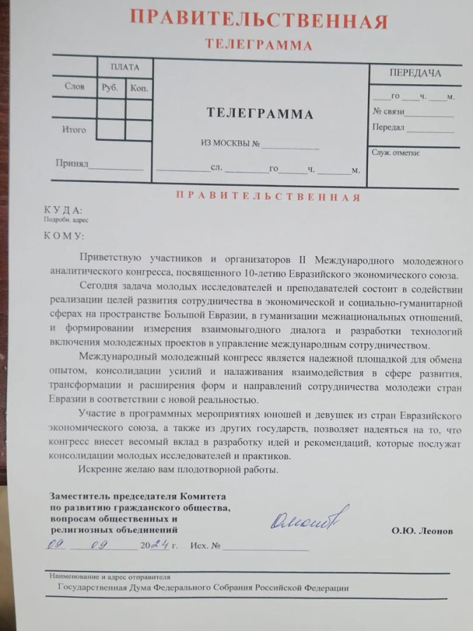 В Кыргызско-Российском Славянском университете им. Б.Н. Ельцина стартовал II Международный молодёжный аналитический конгресс «Молодёжь в Большой Евразии: потенциал, риски, безопасность, сотрудничество» посвященный 10-летию ЕАЭС.
