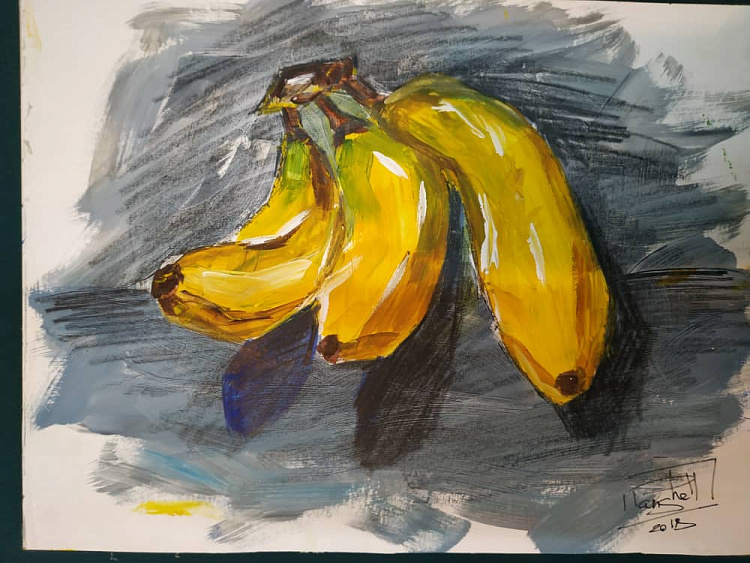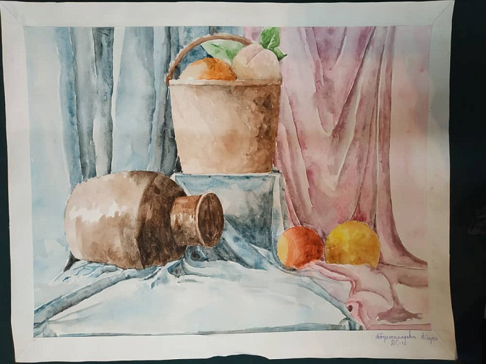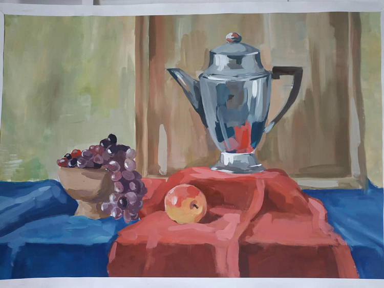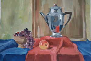 Still life with household items and fruits