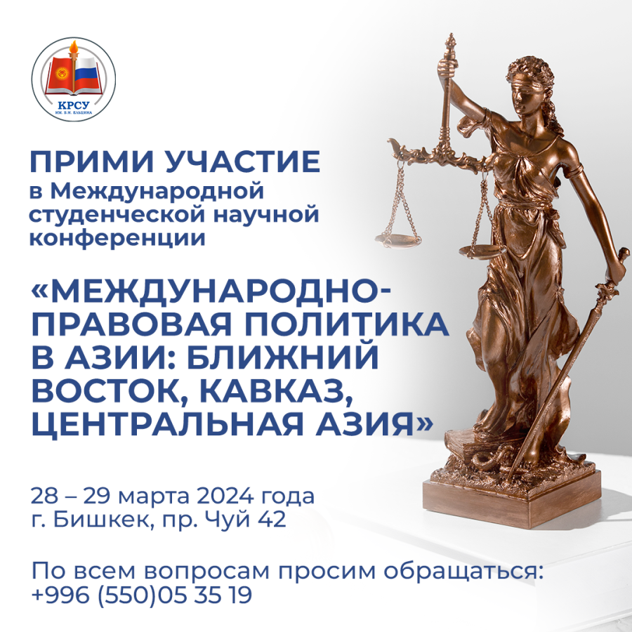 International student scientific conference In order to encourage student research on this issue, the Kyrgyz-Russian Slavic University named after. B.N. Yeltsin (Department of International and Constitutional Law) announces the International Student Scientific Conference «INTERNATIONAL LEGAL POLICY IN ASIA: MIDDLE EAST, CAUCASUS, CENTRAL ASIA», which will be held in Bishkek on March 28 – 29, 2024.