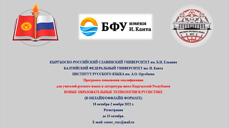 From October 18 to November 2, 2022, the Institute of Russian Language named after O.A. Orusbaeva KRSU in partnership with the Baltic Federal University. AND. Kanta (Russian Federation, Kaliningrad) will conduct an online advanced training program «New educational technologies in Russian studies» (16 academic hours).