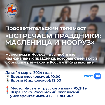 Educational teleconference «Celebrating the holidays: Maslenitsa and Nooruz». On March 14 it will be held at the Institute of Russian Language of the RUDN University and at the Kyrgyz-Russian Slavic University named after B.N. Yeltsin