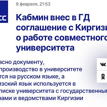 The Cabinet of Ministers submitted to the State Duma an agreement with Kyrgyzstan on the work of a joint university 9 february 2024 Media about KRSU