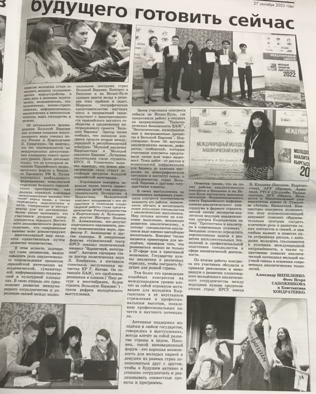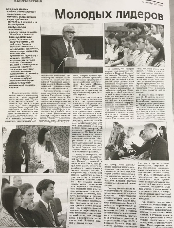 Ключевые вопросы проблем международного сотрудничества молодёжи евроазиатских стран предметно обсуждены в Бишкеке и на Иссык-Куле на международном молодёжном аналитическом конгрессе «Молодёжь в Большой Евразии: потенциал, риски, безопасность, сотрудничество», где собрались десятки молодых аналитиков — экономистов, социологов, политологов, историков, юристов. Они представили друг другу и старшим уважаемым коллегам свои научные работы, обменялись опытом, а также приняли активное участие в аналитических конкурсах «Молодой аналитик Кыргызстана» и «Молодой аналитик Евразии». Столь масштабный аналитический форум прошёл на широкой региональной площадке впервые.