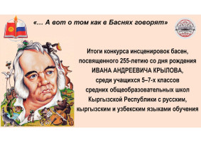 Подведены итоги конкурса инсценировок басен И. А. Крылова «… А вот о том как в Баснях говорят» 29.02.2024 Институт русского языка им. А. О. Орусбаева Кыргызско-Российского Славянского университета им. первого Президента РФ Б. Н. Подведены итоги конкурса инсценировок басен И. А. Крылова «… А вот о том как в Баснях говорят»