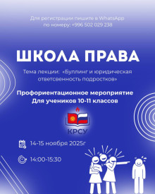 Кыргызско-Российский Славянский университет приглашает учащихся 9–11 классов принять участие в образовательном проекте «Школа права», который состоится 14–15 ноября с 14:00 до 15:30 в главном корпусе КРСУ (аудитория 210).