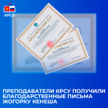 Заведующий кафедрой экологии и защиты в чрезвычайных ситуациях Кыргызско-Российского Славянского университета, кандидат технических наук, доцент Эрик Мамбеков и старший преподаватель кафедры Ширин Абдыкеева награждены благодарственными письмами Жогорку Кенеша Кыргызской Республики.