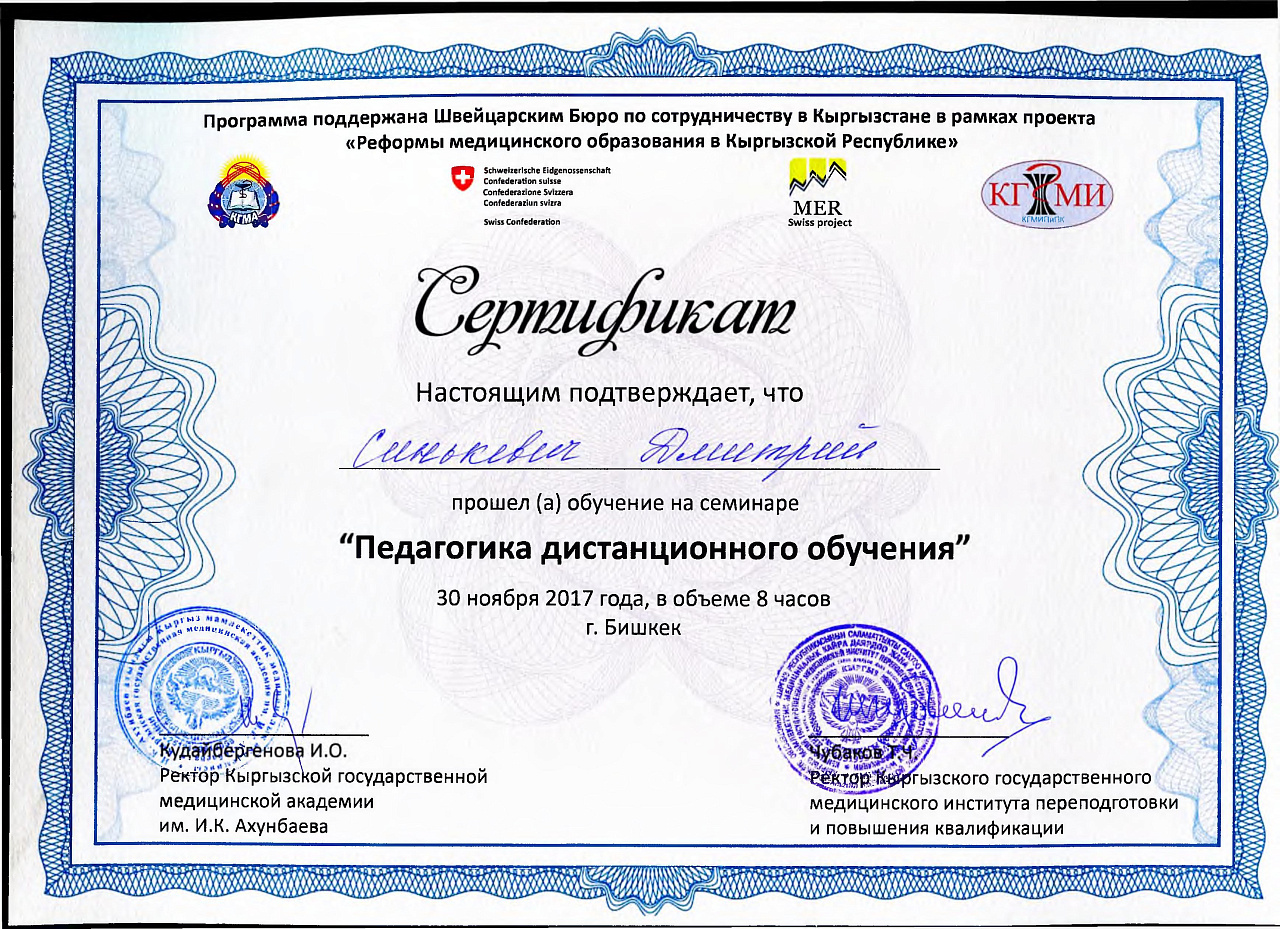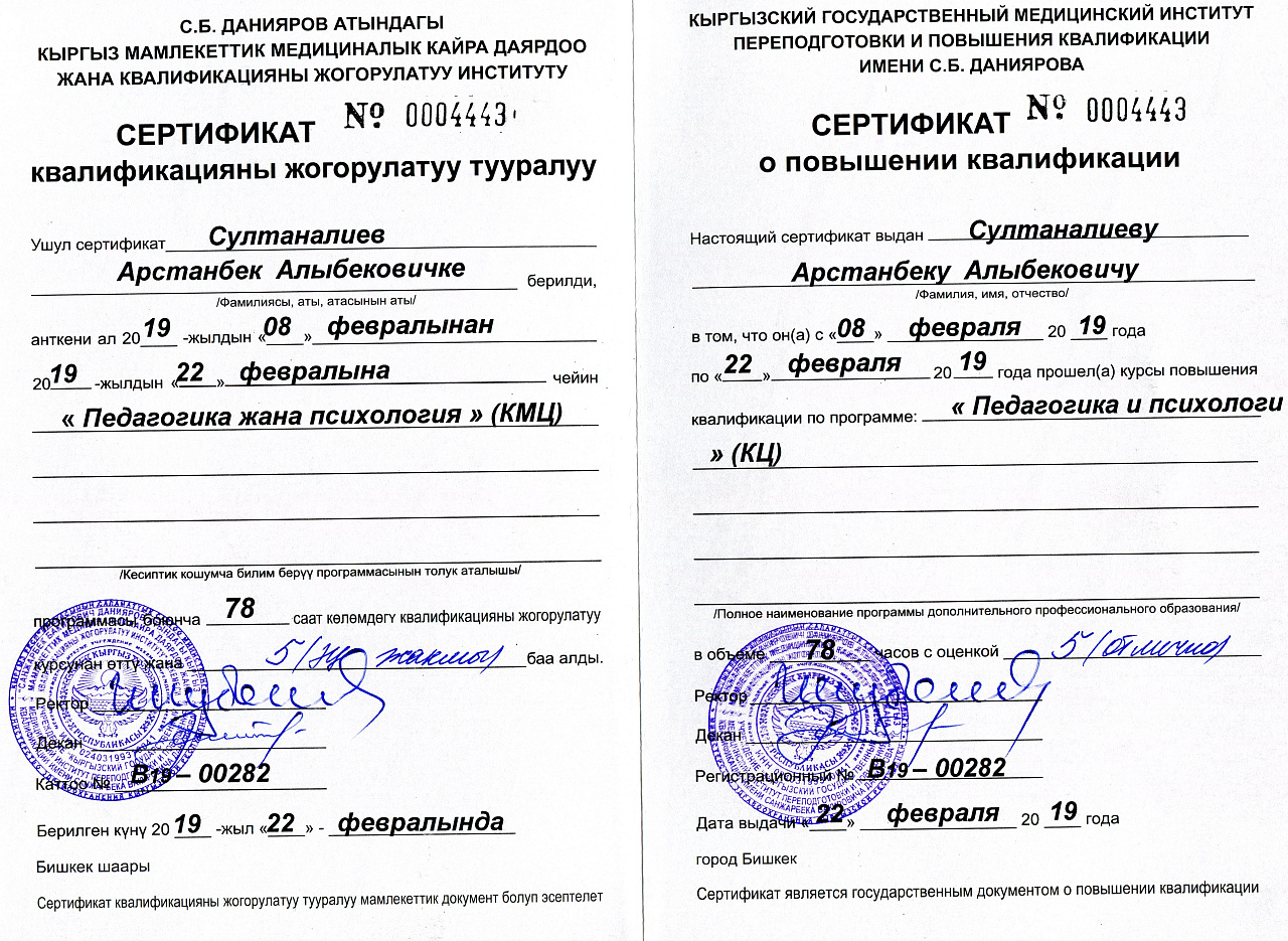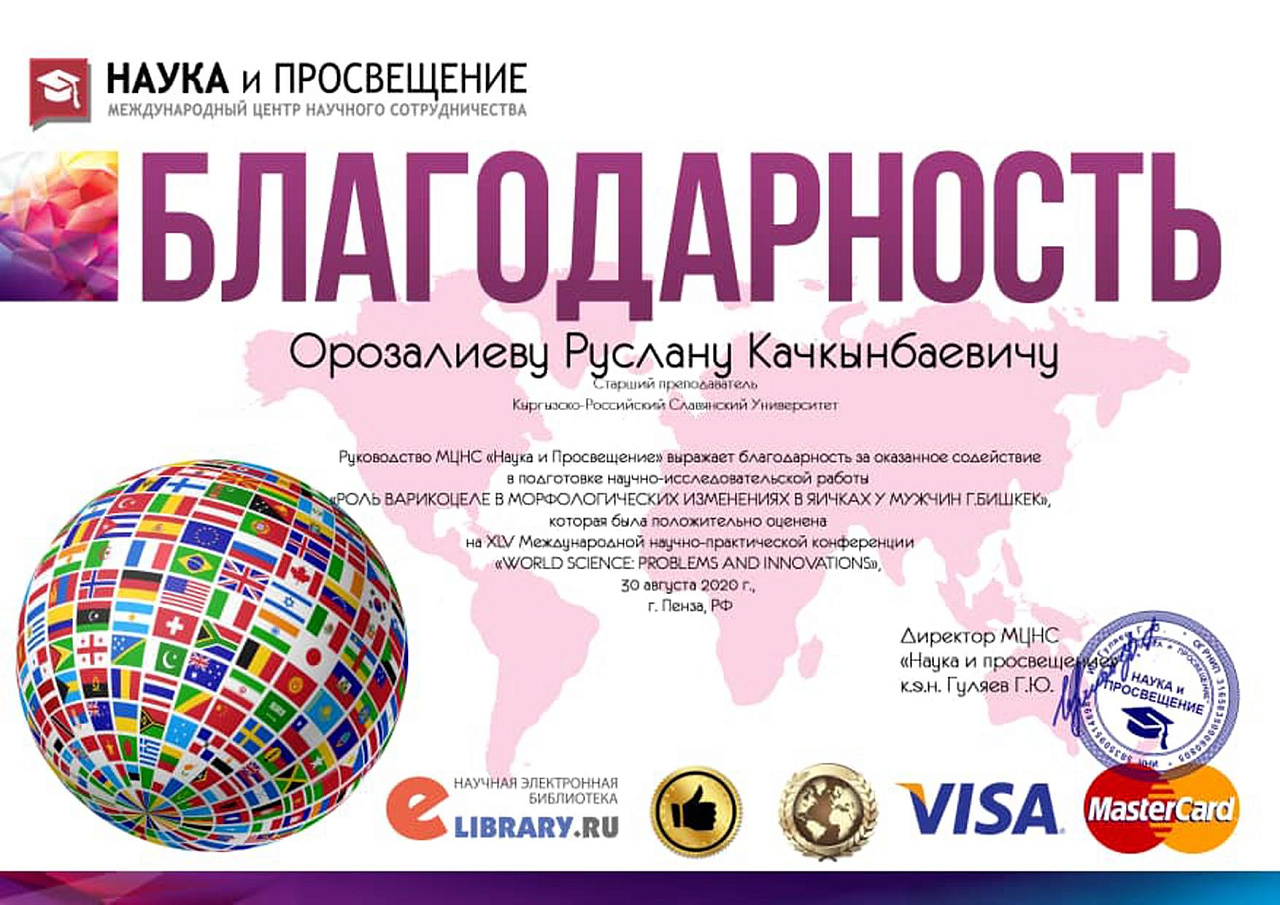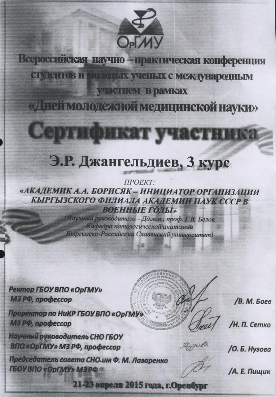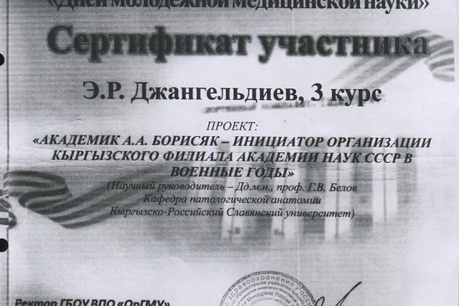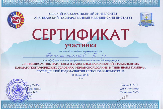 Старший преподаватель Орозалиев Р.К. продолжает работу над кандидатской диссертацией под руководством заведующего кафедрой «Патофизиологии» КРСУ профессора Какеева Б.А., консультантом по морфологии доцента Турганбаева Ж.Т.