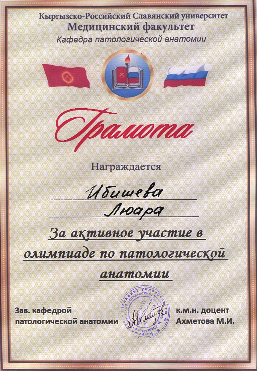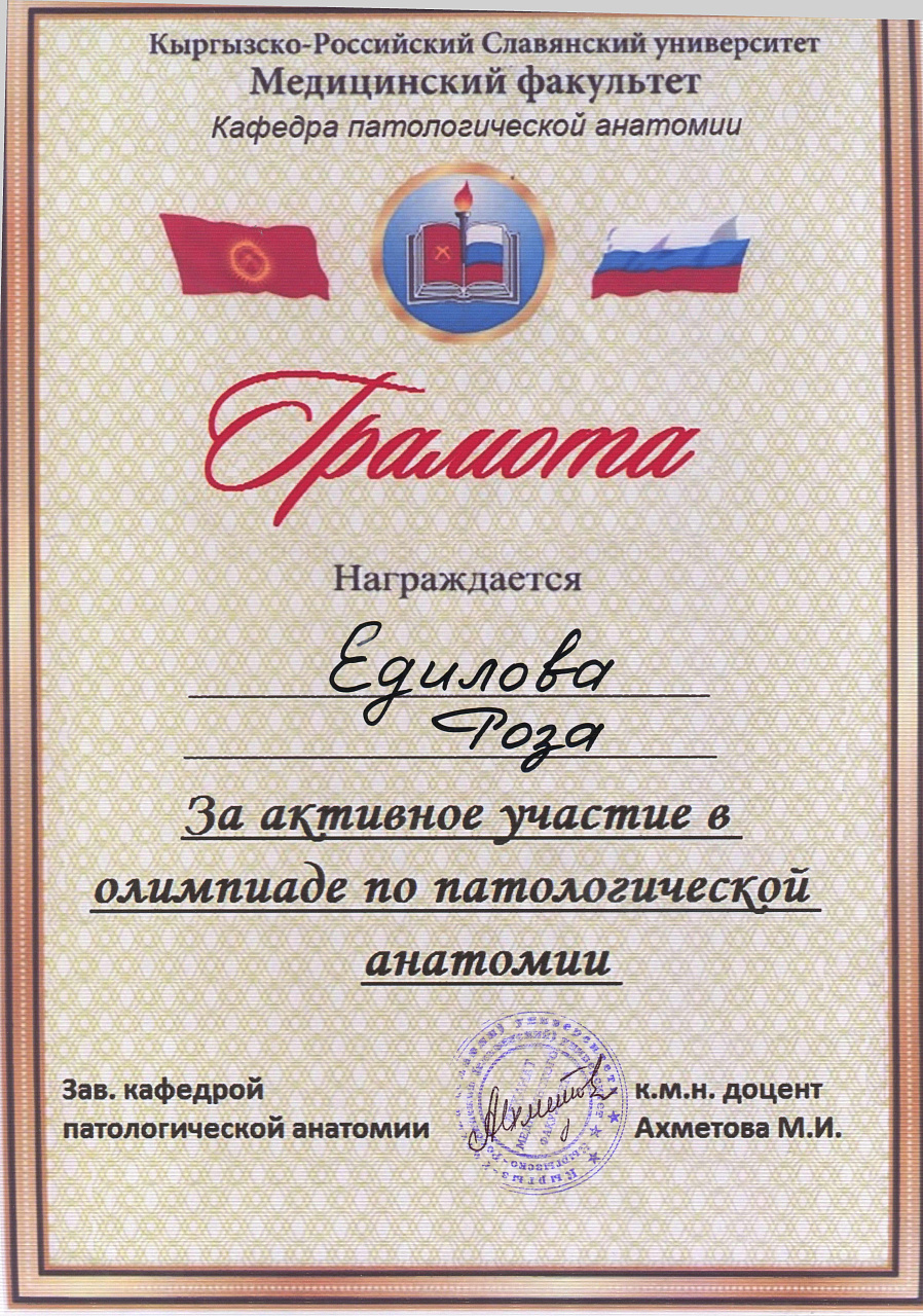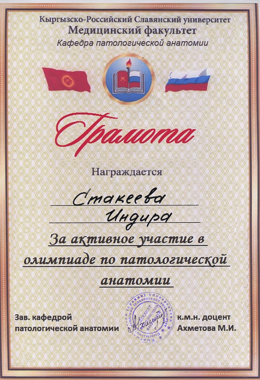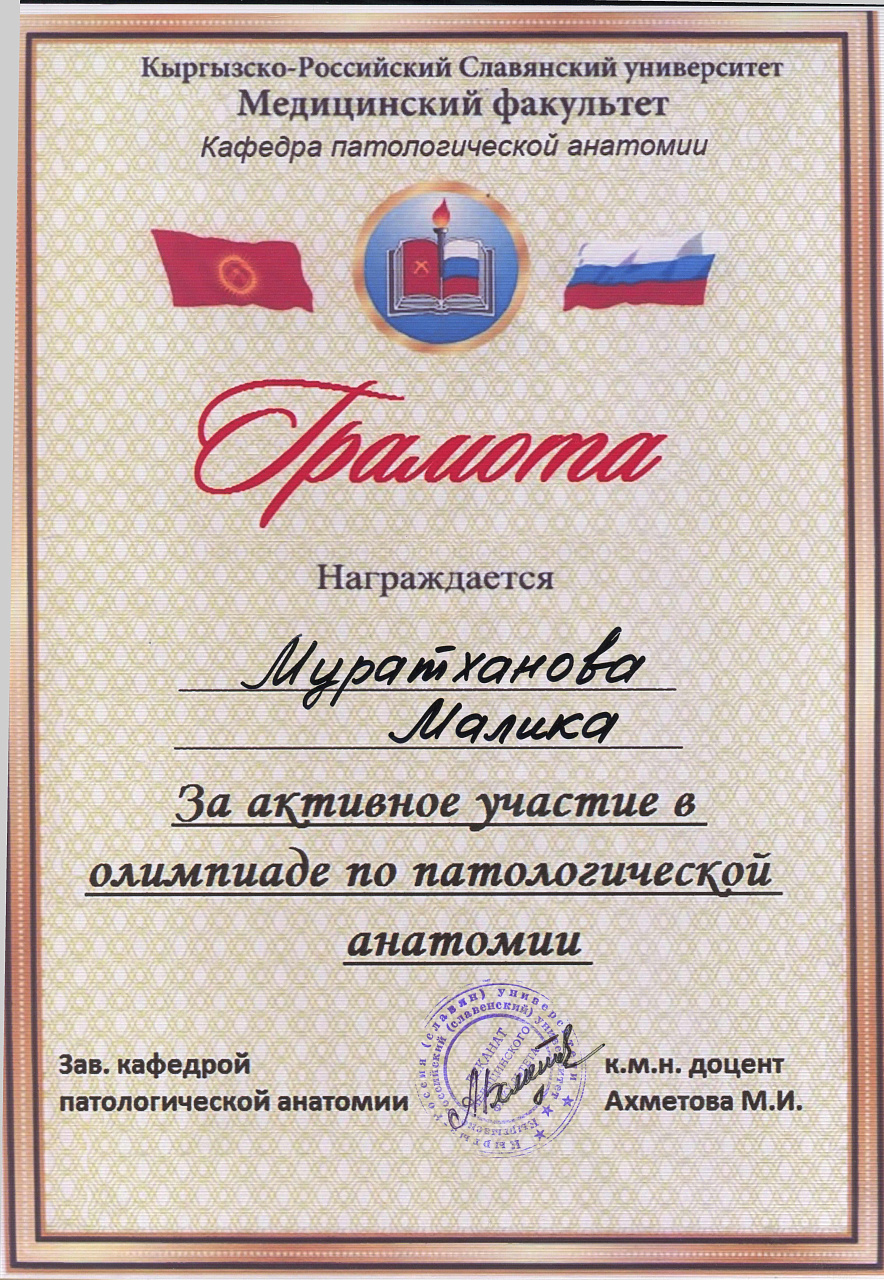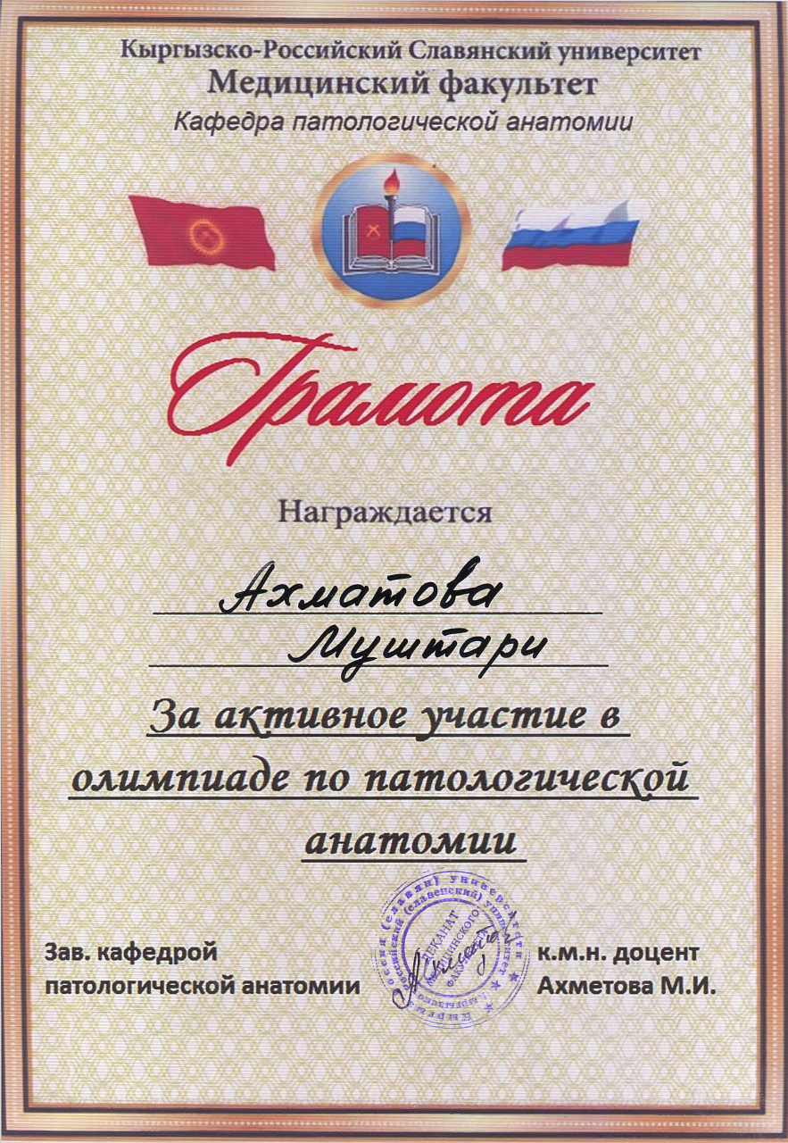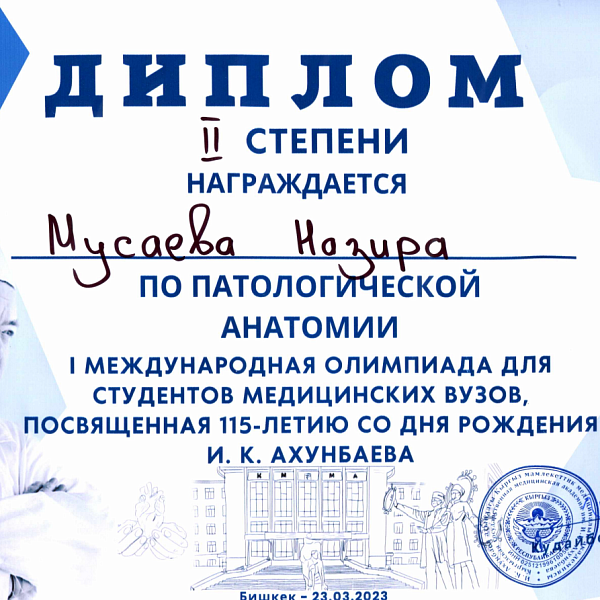 2. Мусаева Н. I международная олимпиада по патологической анатомии для студентов медицинских вузов, посвященная 115-летию со дня рождения И.К. Ахунбаева.- диплом II степени. 23.03.23 г. Бишкек.
