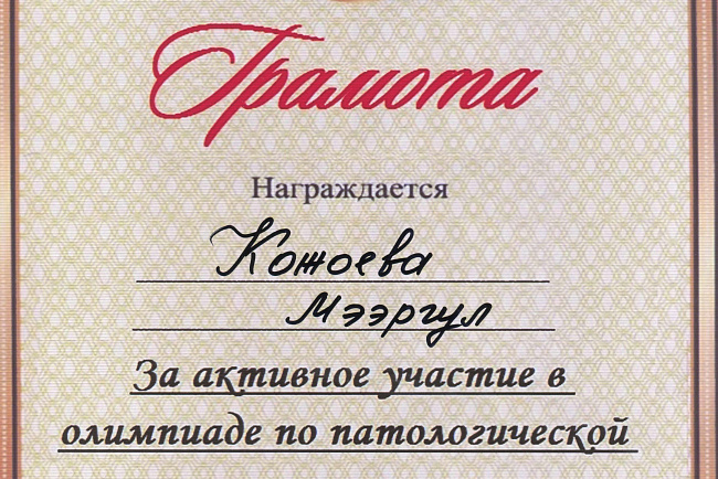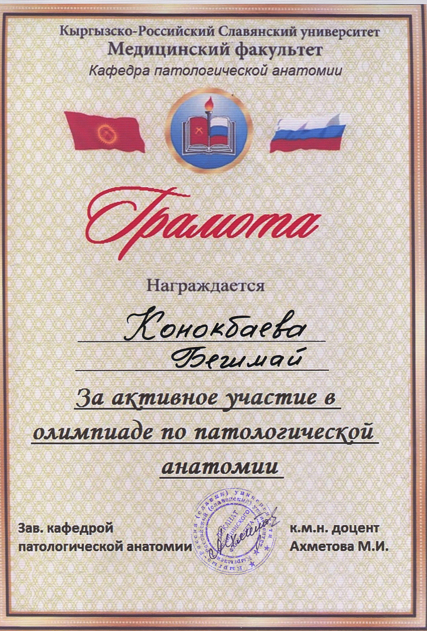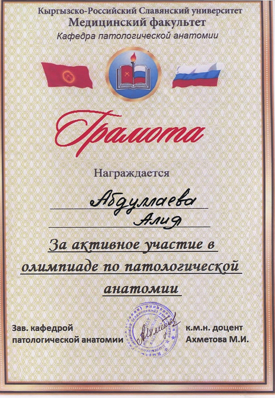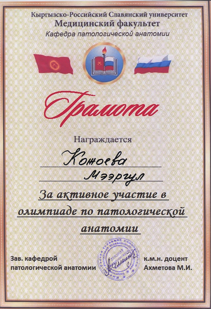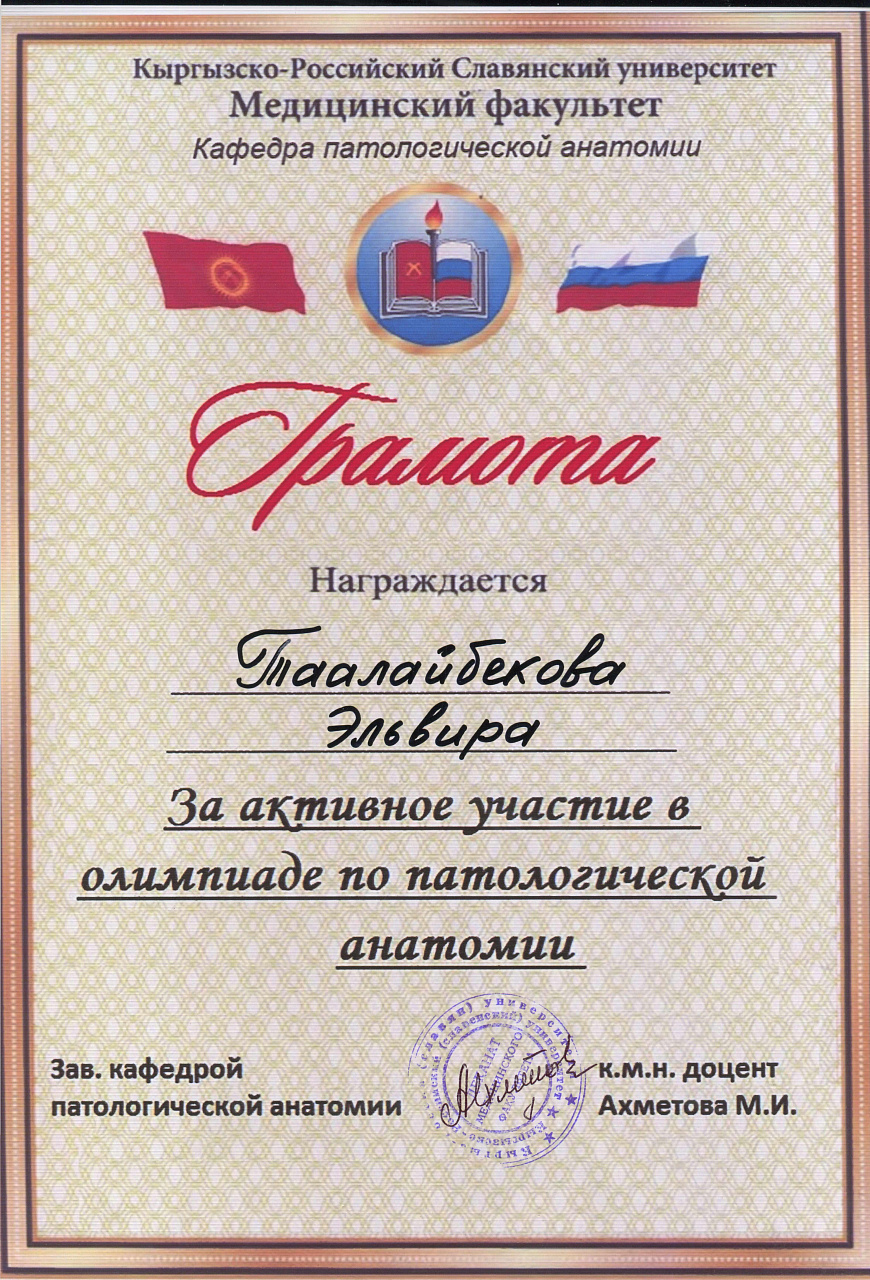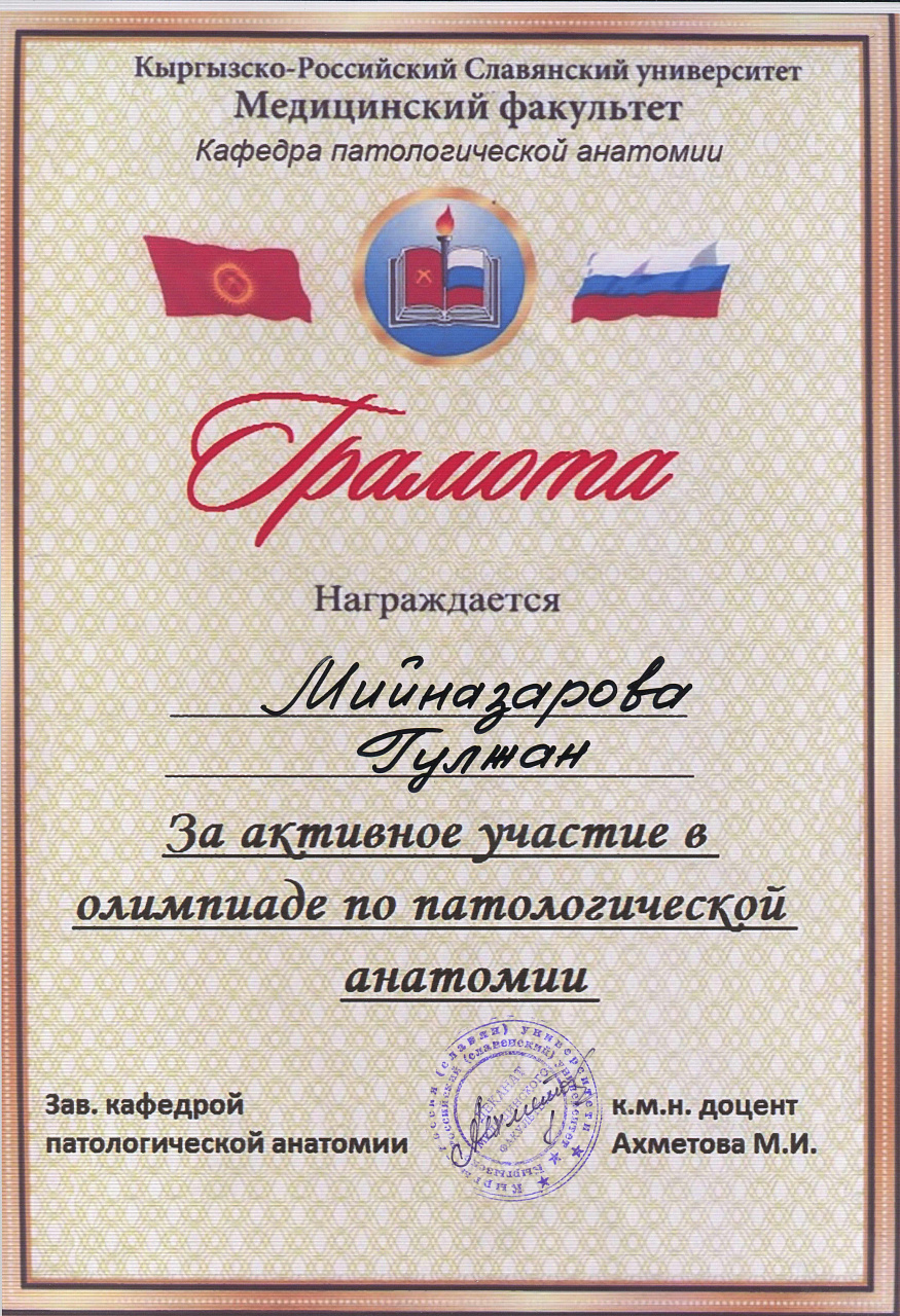 2. Мусаева Н. I международная олимпиада по патологической анатомии для студентов медицинских вузов, посвященная 115-летию со дня рождения И.К. Ахунбаева.- диплом II степени. 23.03.23 г. Бишкек.