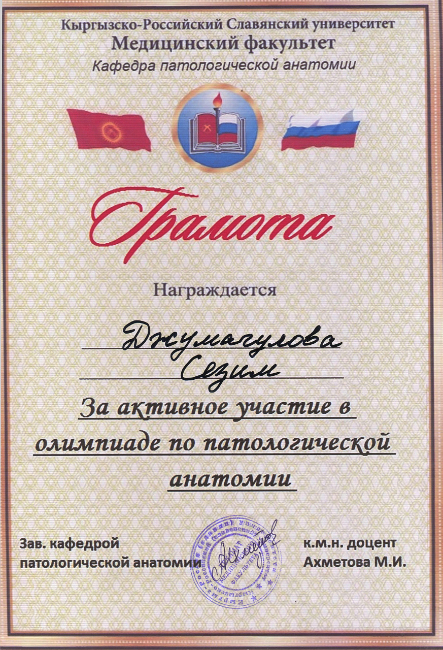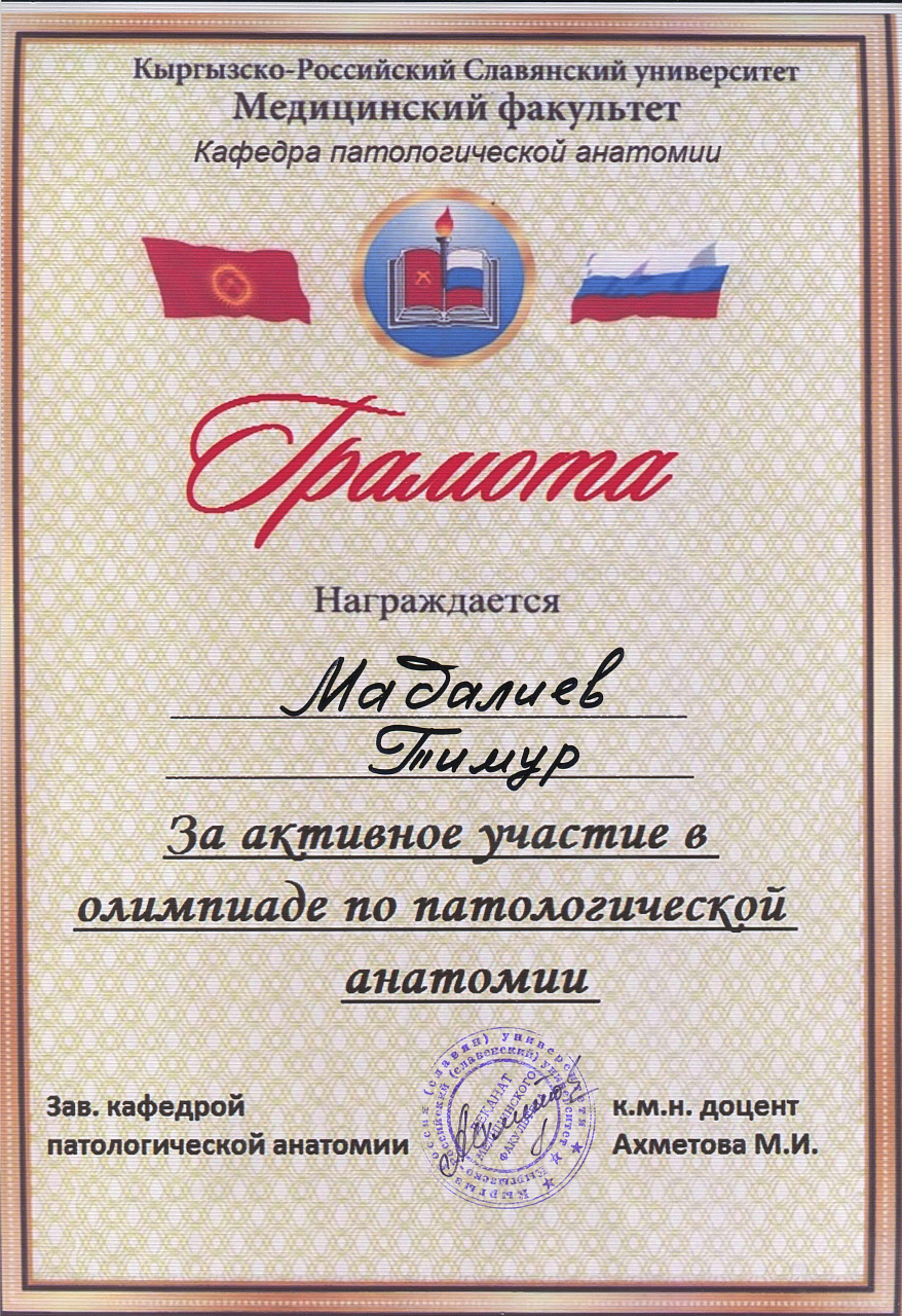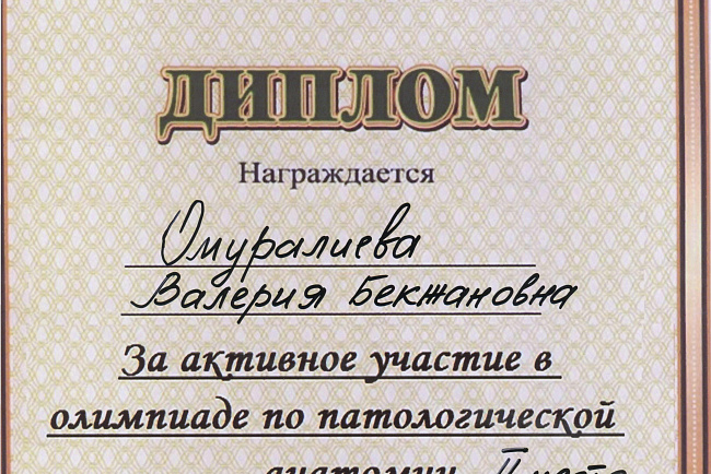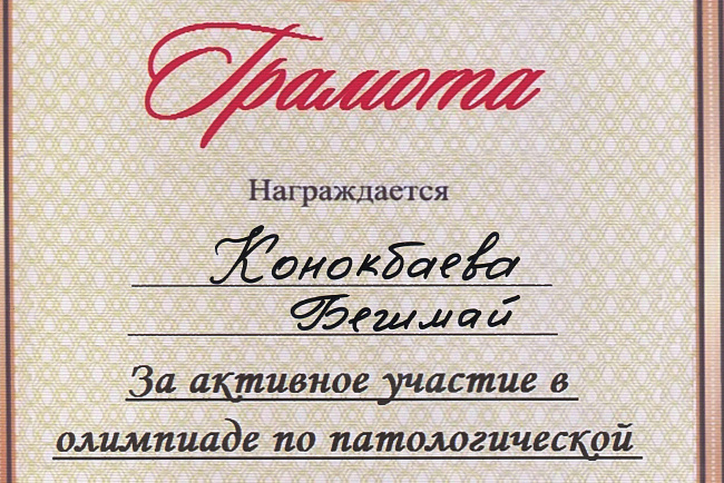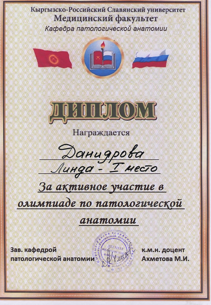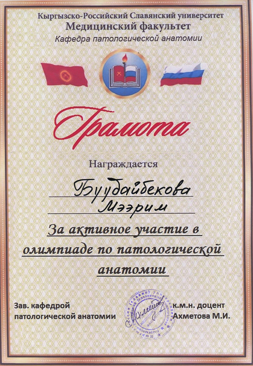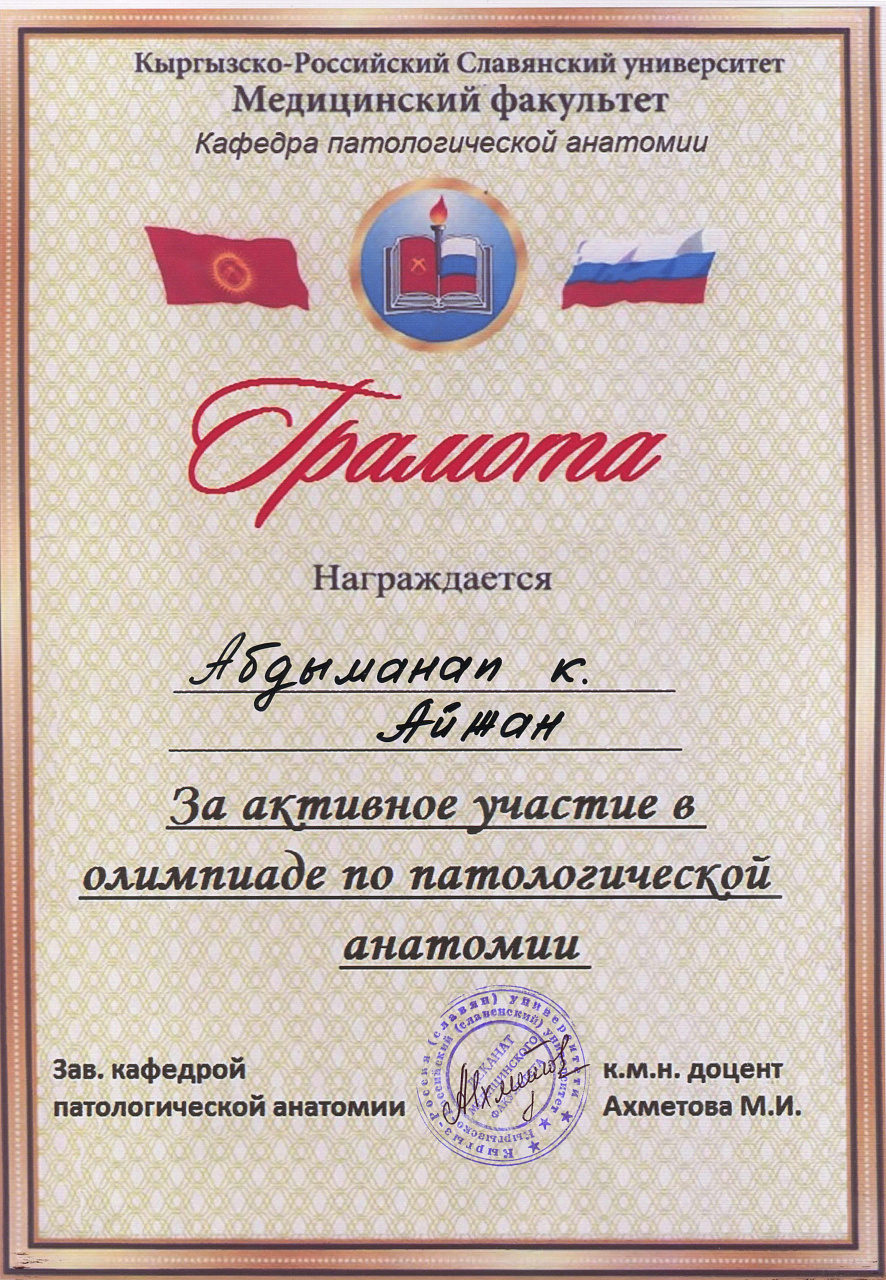 2. Мусаева Н. I международная олимпиада по патологической анатомии для студентов медицинских вузов, посвященная 115-летию со дня рождения И.К. Ахунбаева.- диплом II степени. 23.03.23 г. Бишкек.
