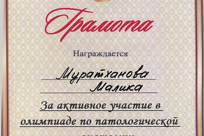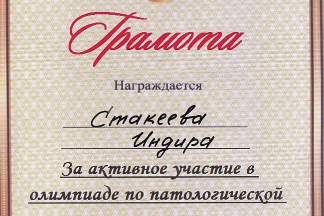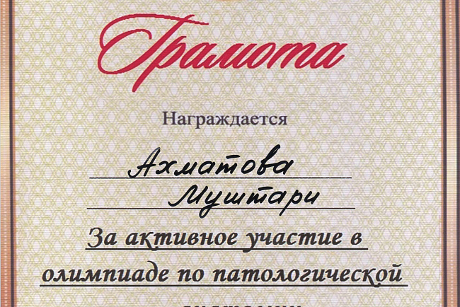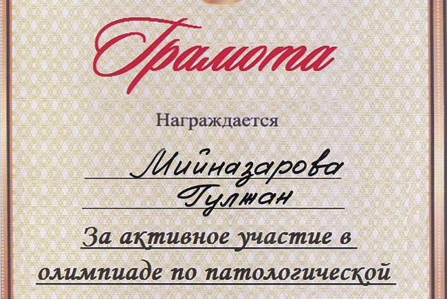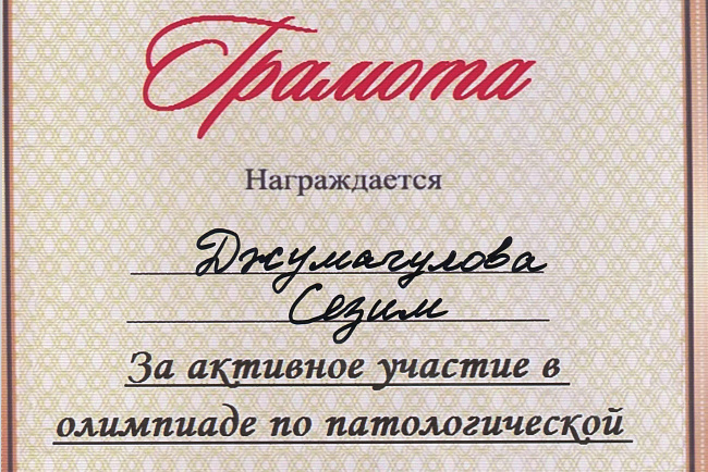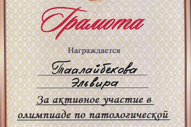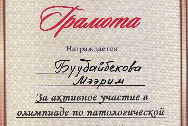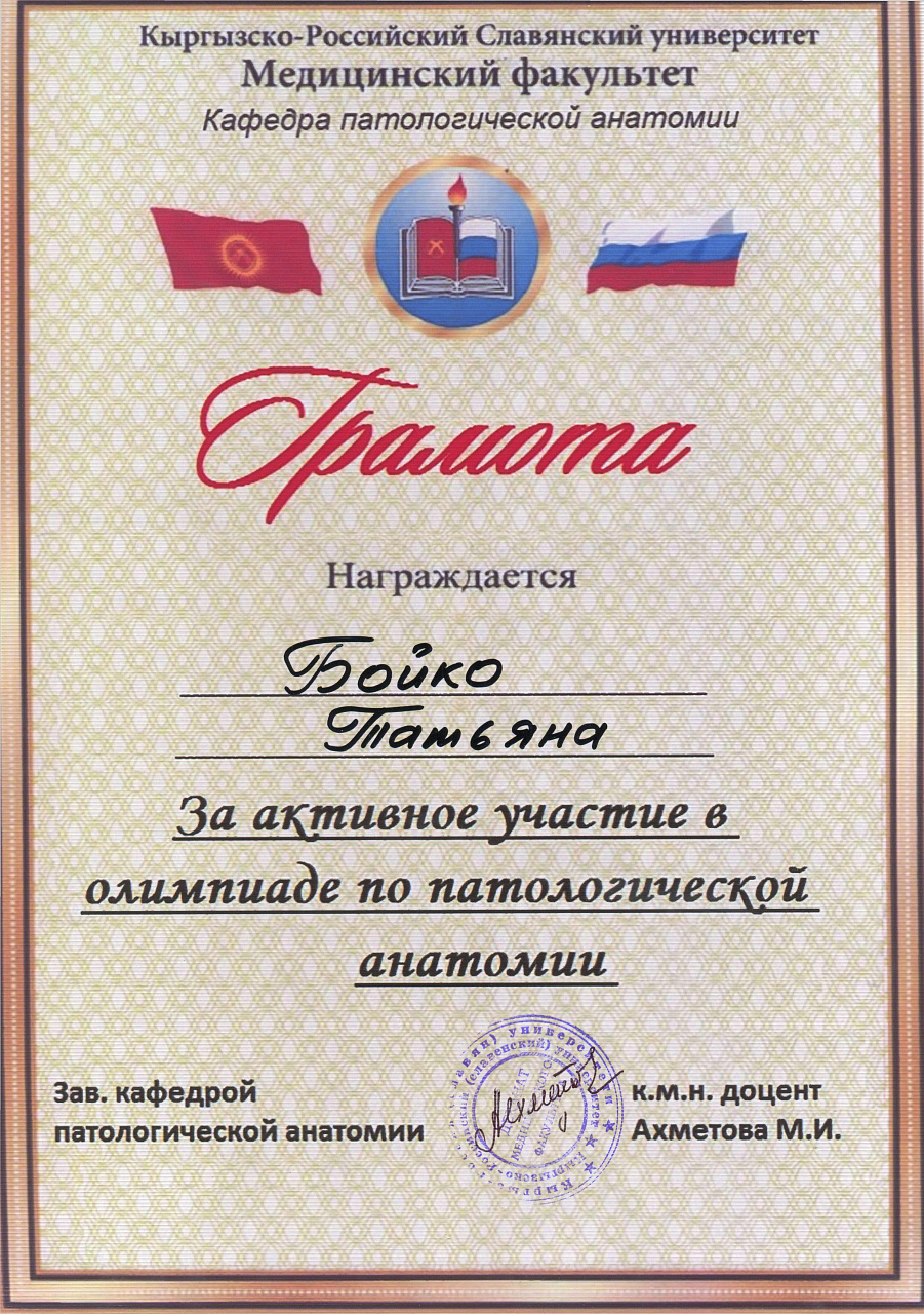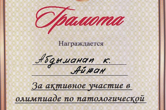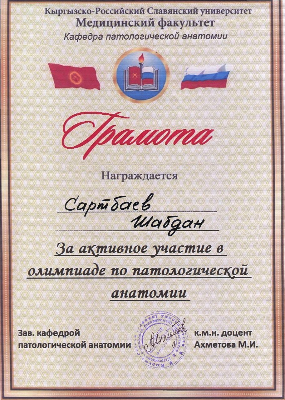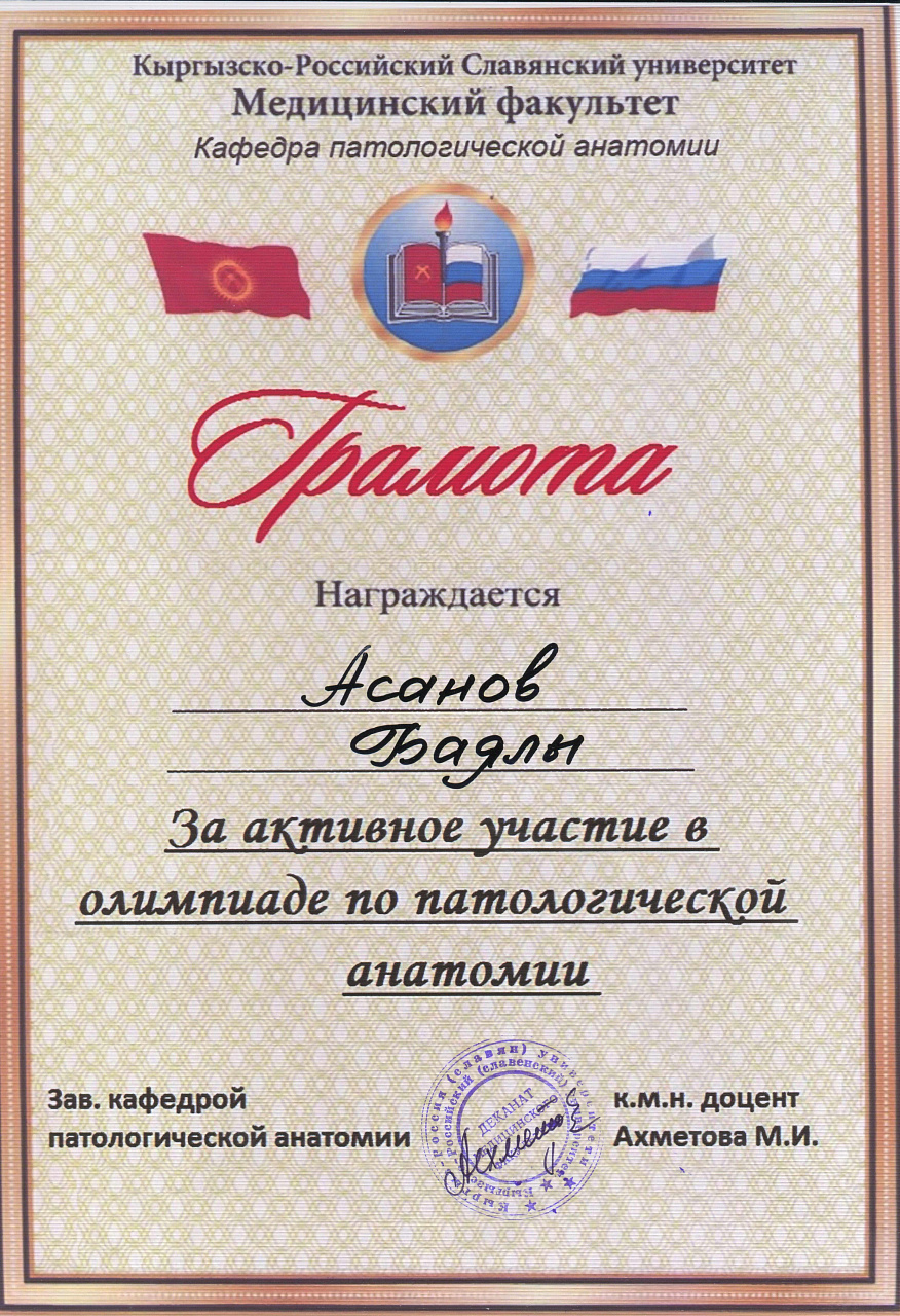 2. Мусаева Н. I международная олимпиада по патологической анатомии для студентов медицинских вузов, посвященная 115-летию со дня рождения И.К. Ахунбаева.- диплом II степени. 23.03.23 г. Бишкек.