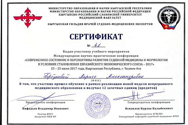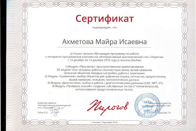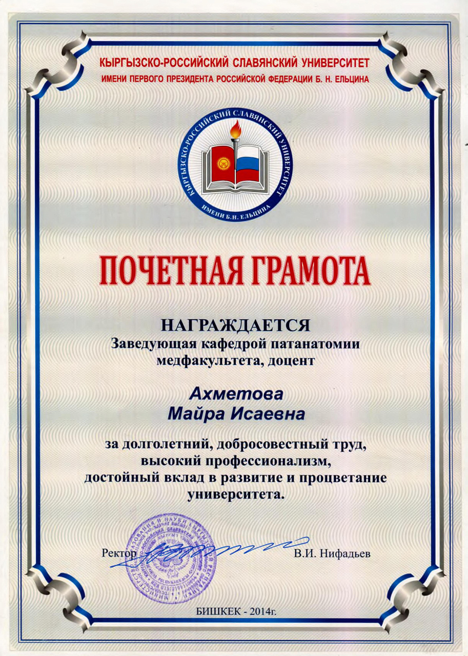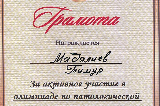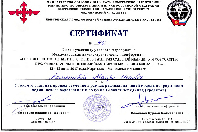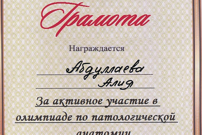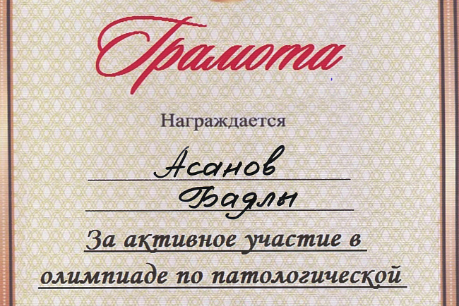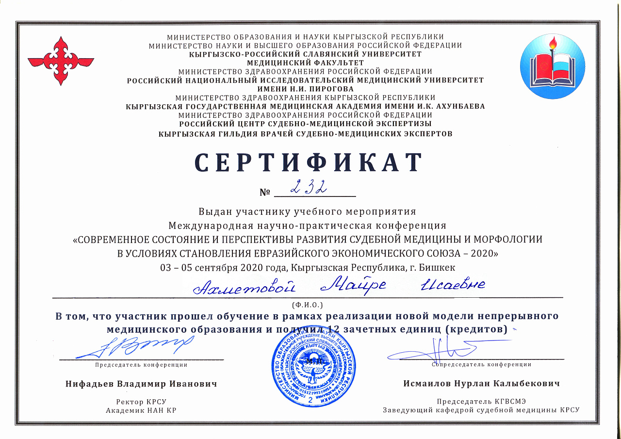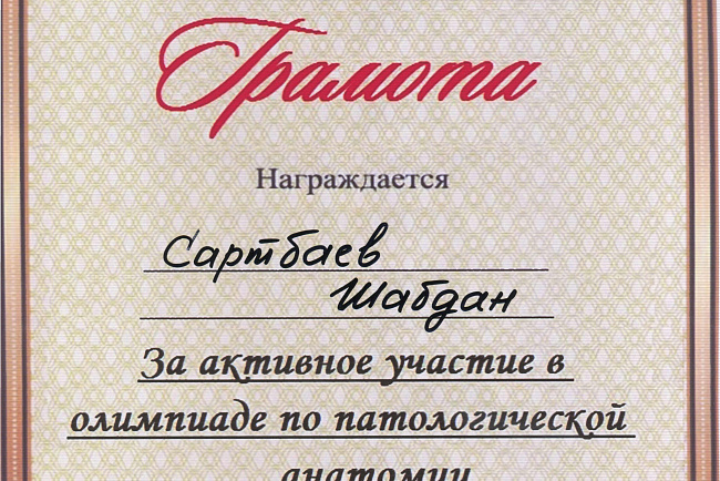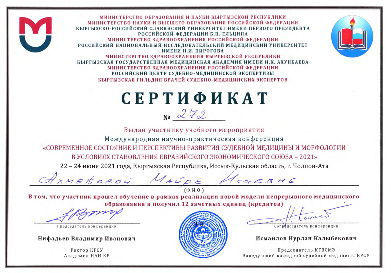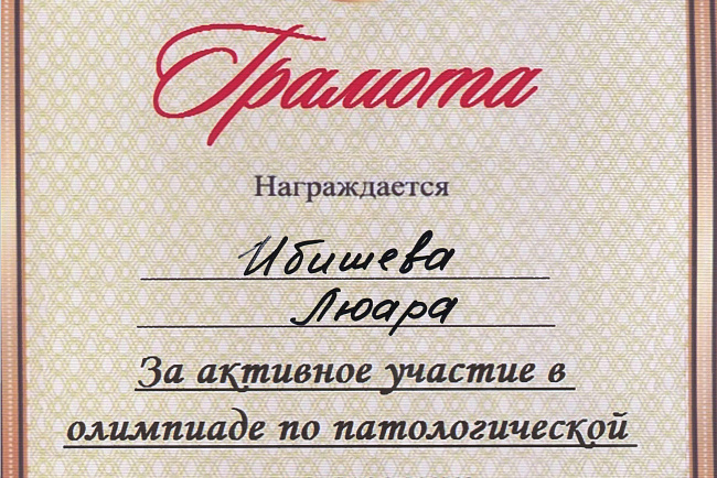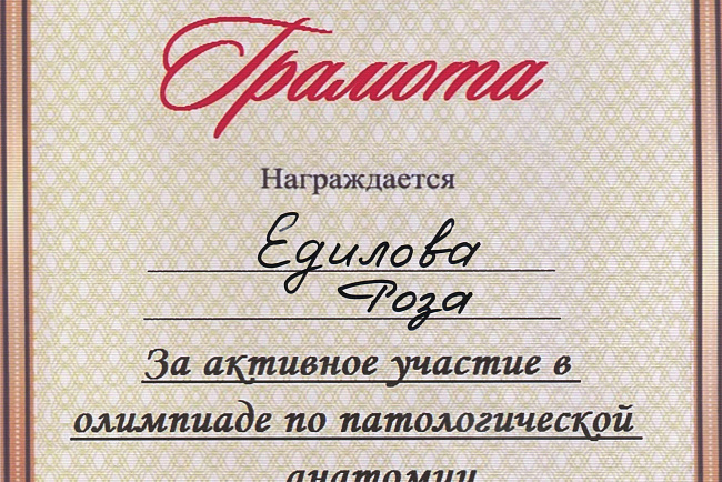 2. Мусаева Н. I международная олимпиада по патологической анатомии для студентов медицинских вузов, посвященная 115-летию со дня рождения И.К. Ахунбаева.- диплом II степени. 23.03.23 г. Бишкек.