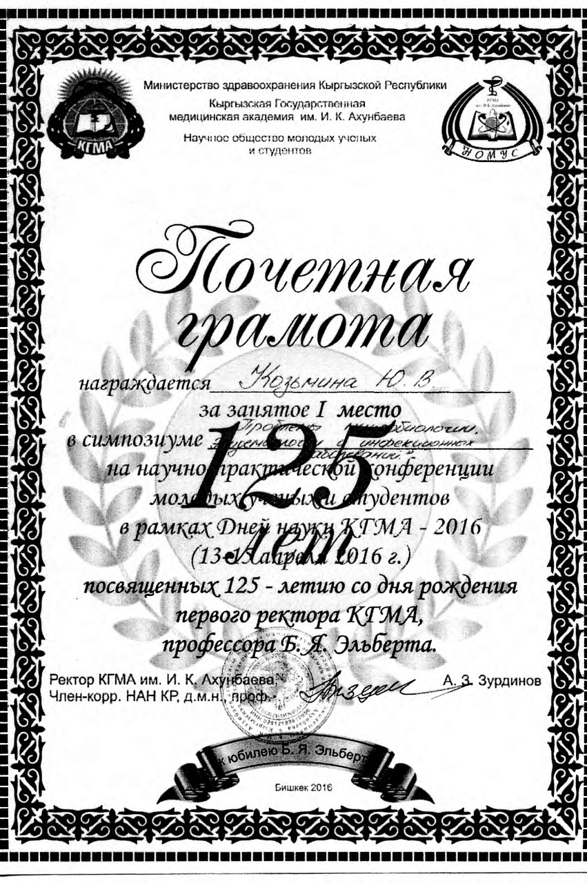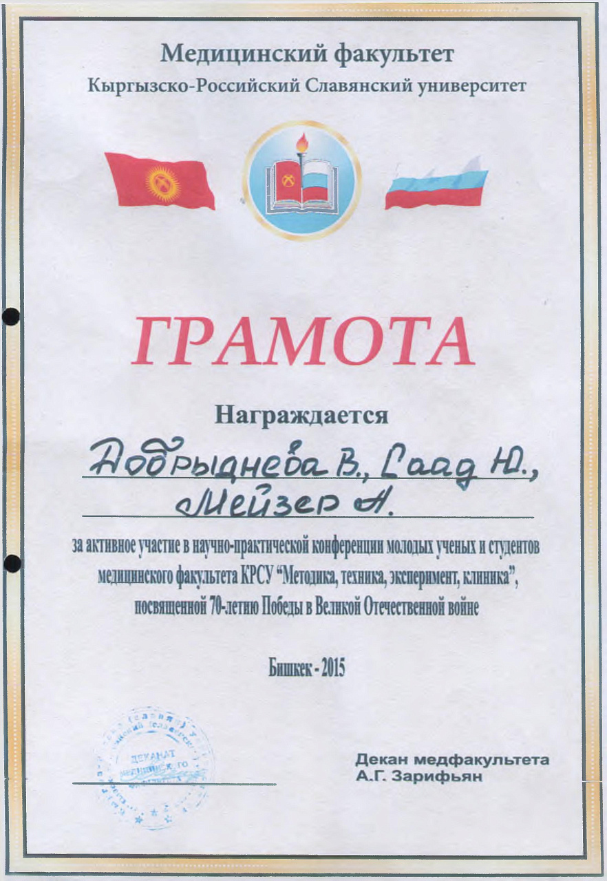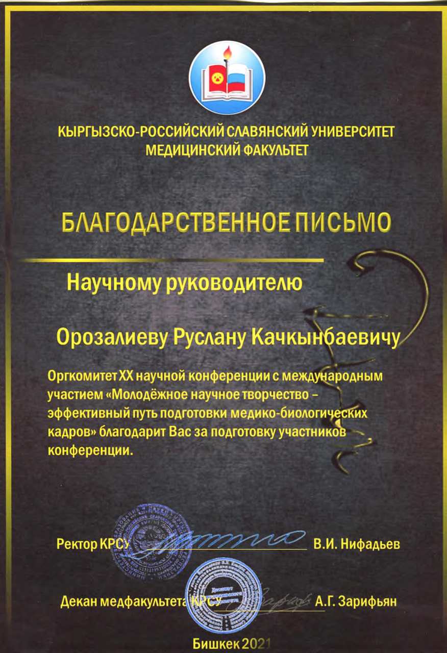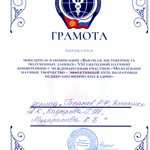1. Гасанов Р.Ф., Василенко А.К., Кадырова Г.Ш.,Музарапова К.Б. - грамота - победитель в номинации " Высокая достоверность полученных данных " XXI ежегодной научной конференции с международным участием "Молодежное научное творчество - эффективный путь подготовки медико- биологических кадров". г. Бишкек 2022г.