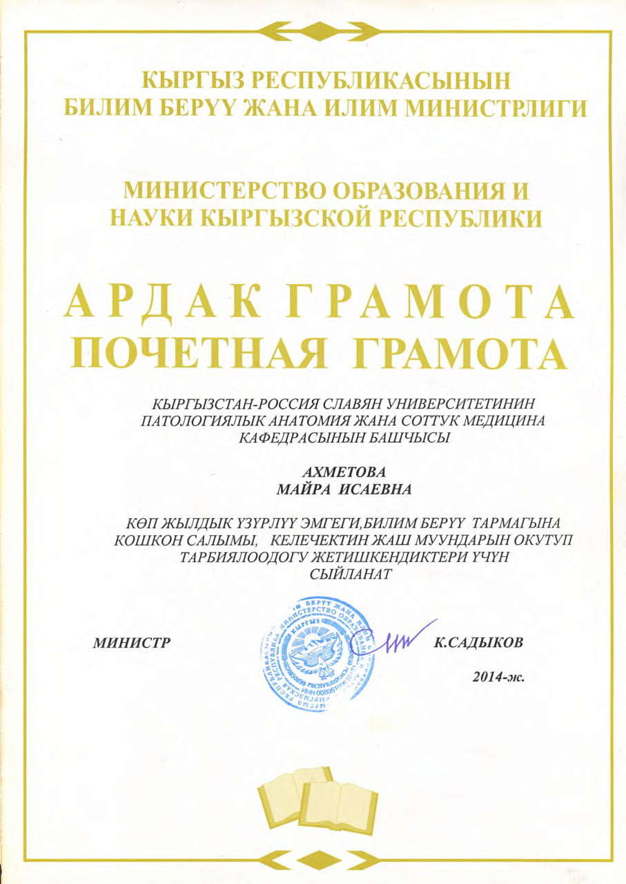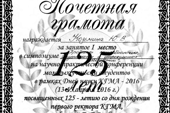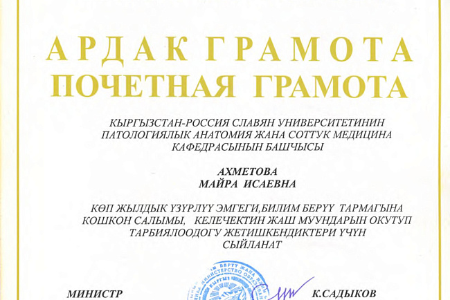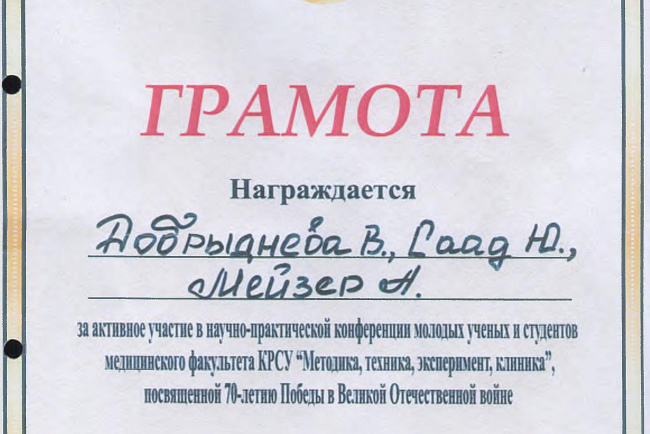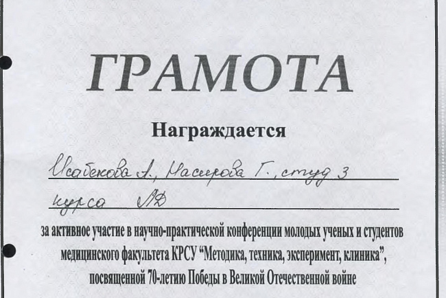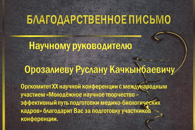 1. Гасанов Р.Ф., Василенко А.К., Кадырова Г.Ш.,Музарапова К.Б. - грамота - победитель в номинации " Высокая достоверность полученных данных " XXI ежегодной научной конференции с международным участием "Молодежное научное творчество - эффективный путь подготовки медико- биологических кадров". г. Бишкек 2022г.