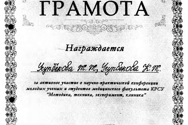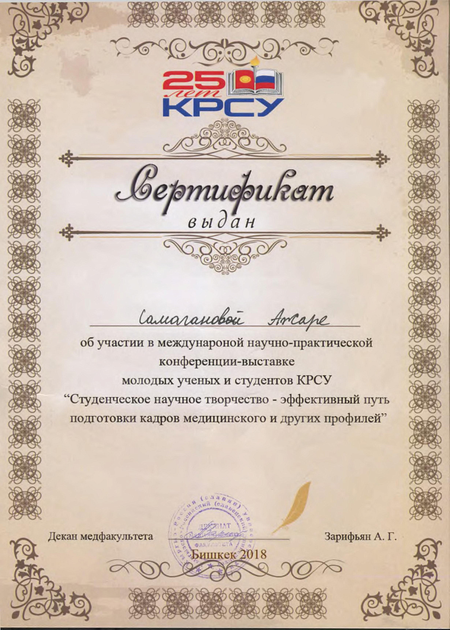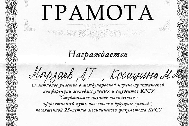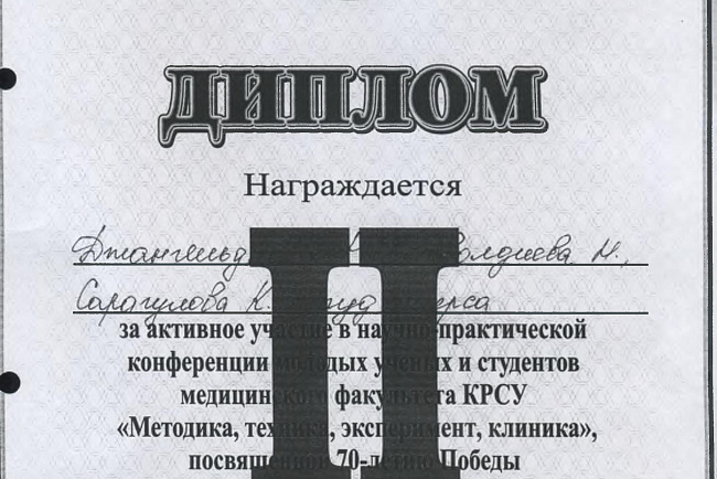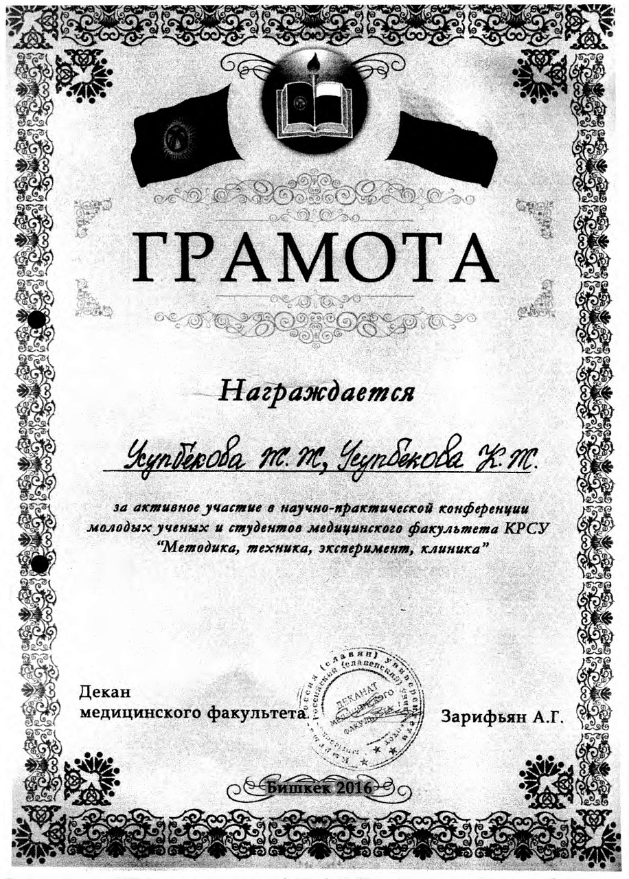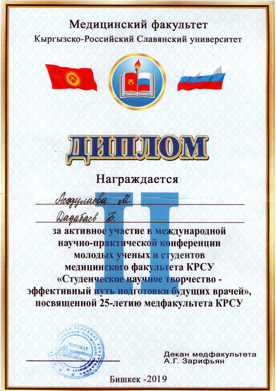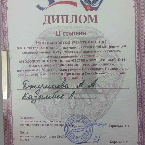 4. Джумаева А.А. Казымбек А. XXII ежегодная итоговая научно-практическая конференция молодых ученых и студентов медицинского факультета с международным участием " Молодежное научное творчество- эффективный путь подготовки медико- биологических кадров", посвященной 30-летию Кыргызско-Российского Славянского университета им. первого Президента Российской Федерации б.Н. Ельцина 19 мая 2023 г. Бишкек.-диплом II степени.