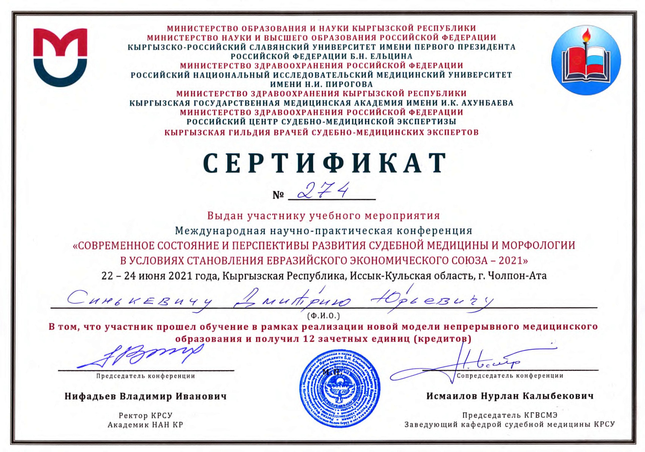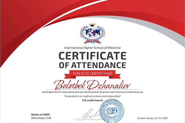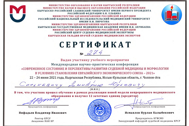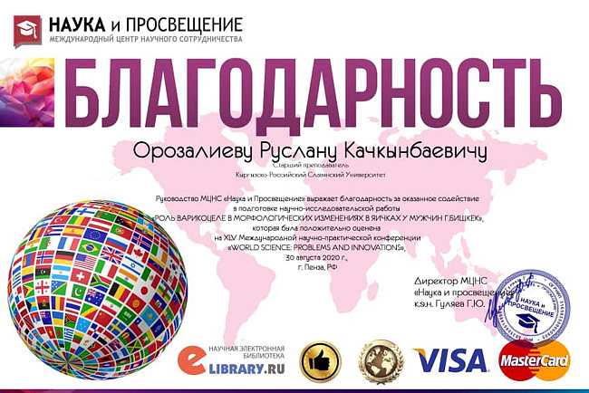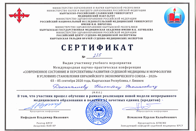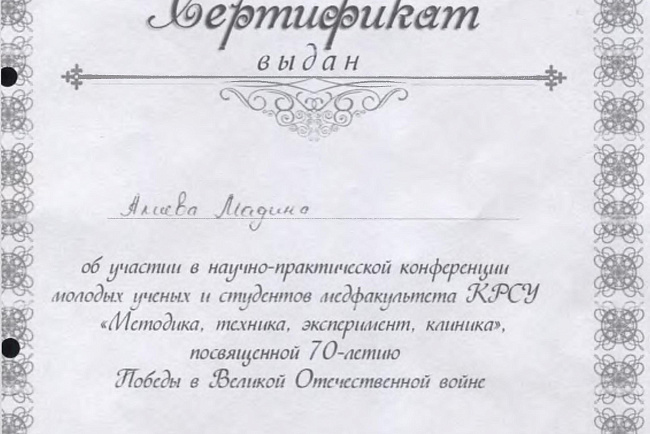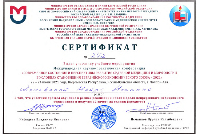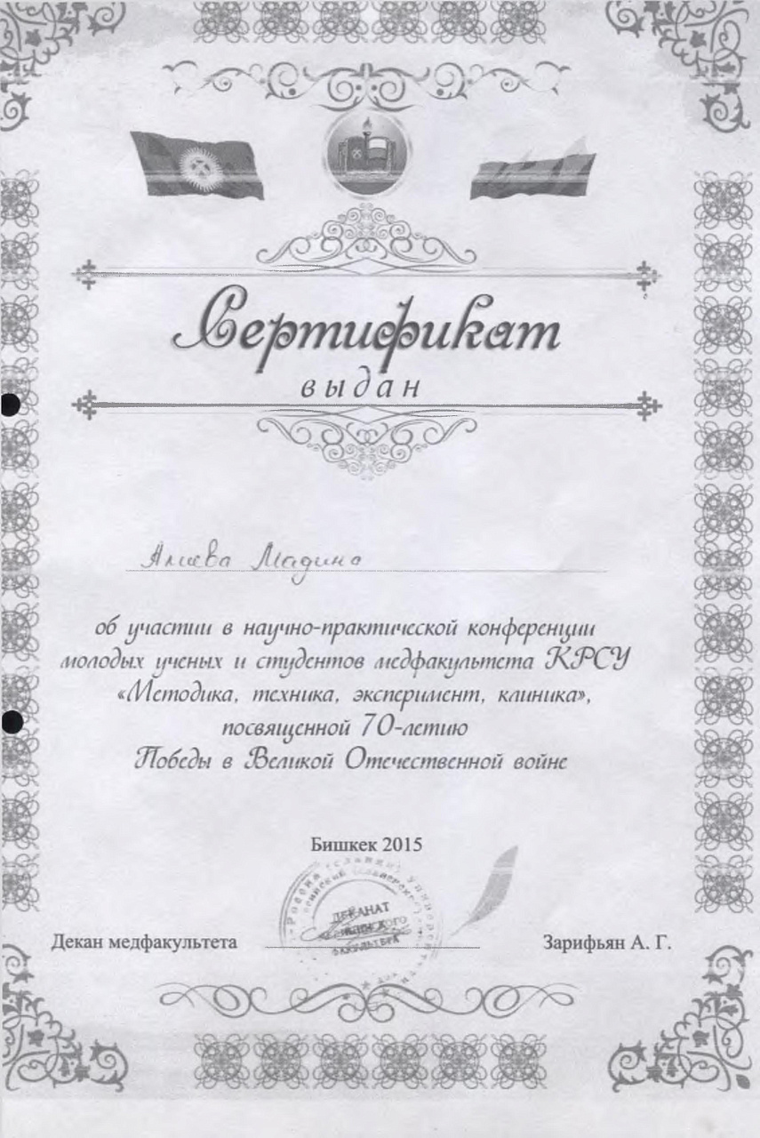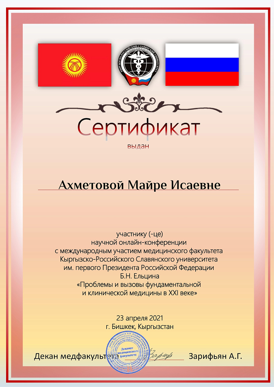 4. Джумаева А.А. Казымбек А. XXII ежегодная итоговая научно-практическая конференция молодых ученых и студентов медицинского факультета с международным участием " Молодежное научное творчество- эффективный путь подготовки медико- биологических кадров", посвященной 30-летию Кыргызско-Российского Славянского университета им. первого Президента Российской Федерации б.Н. Ельцина 19 мая 2023 г. Бишкек.-диплом II степени.