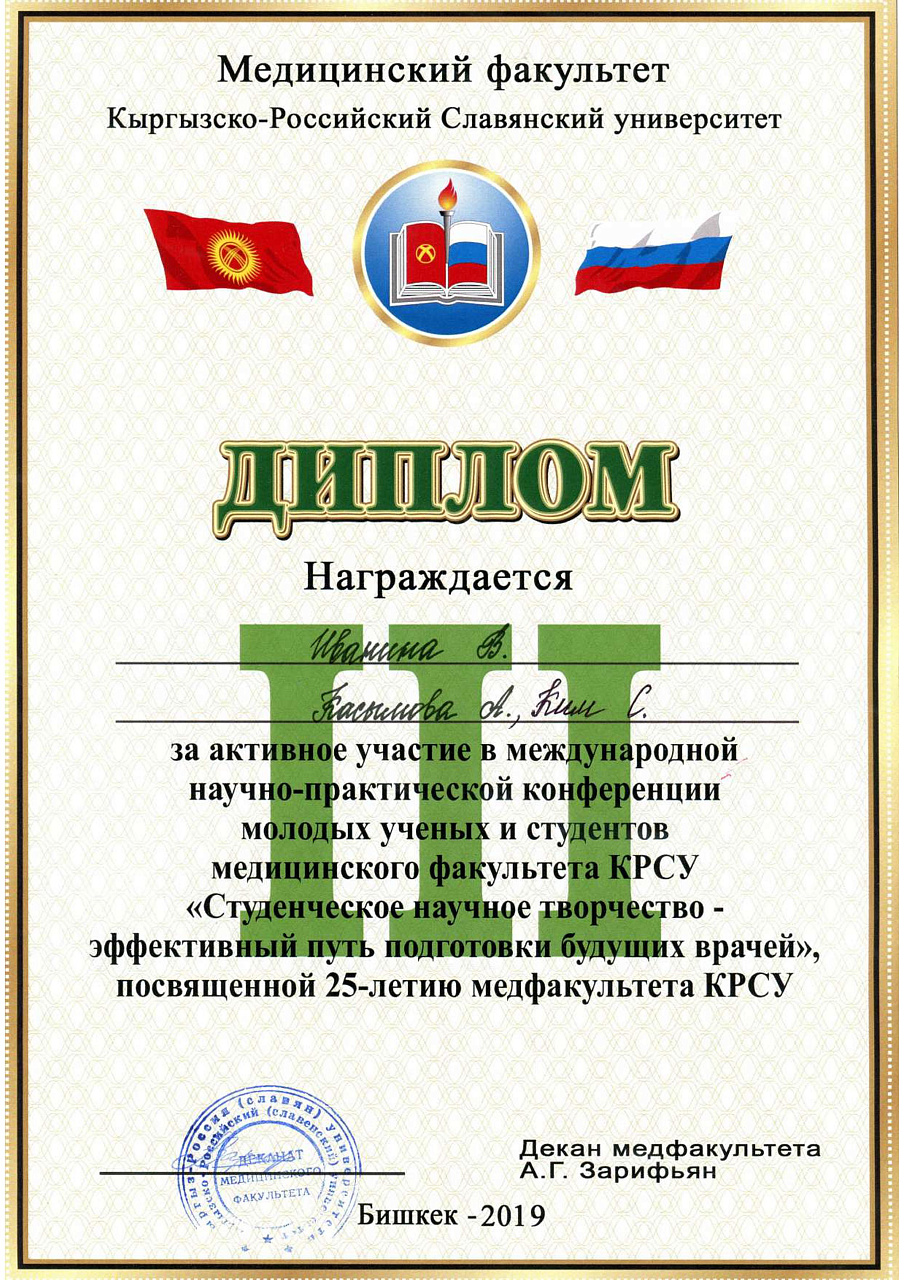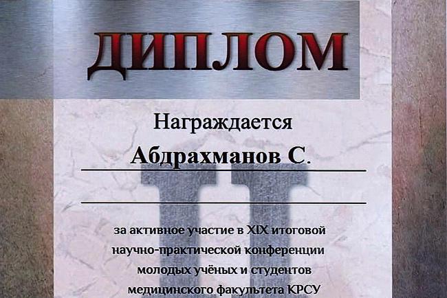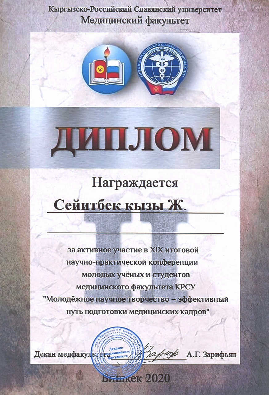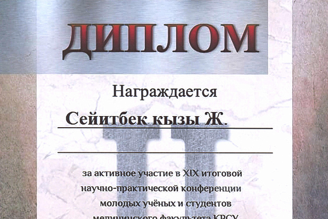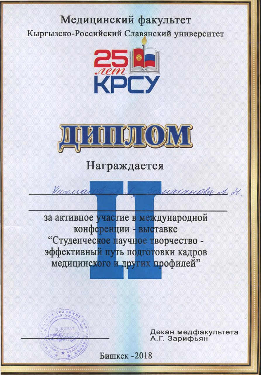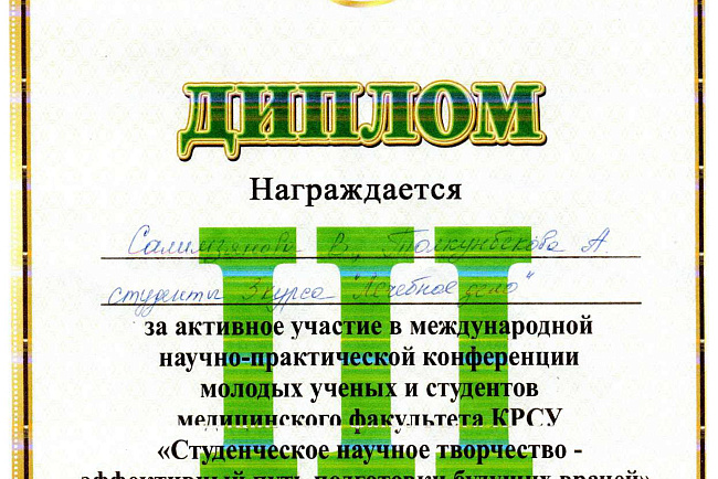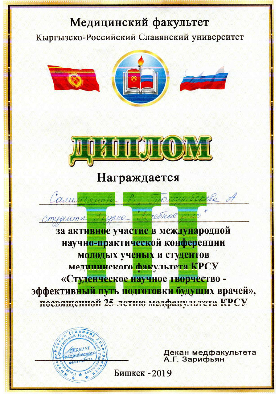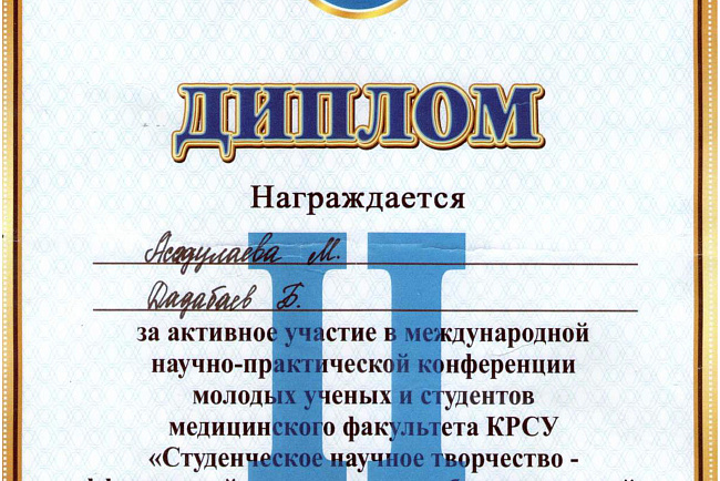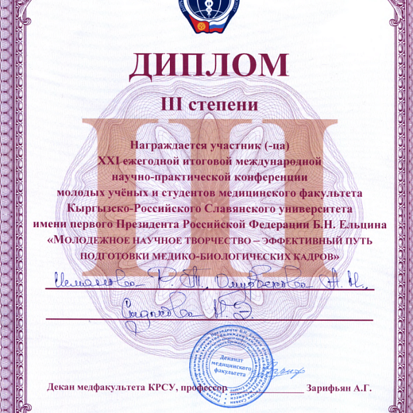 2. Исмаилова Р.Т., Омурбекова А.Н., Сыдыкова Н.Э.- диплом III степени " XXI ежегодной итоговой международной научно-практической конференции молодых ученых и студентов медицинского факультета Кыргызско-Российского Славянского университета имени первого Президента Российской Федерации Б.Н. Ельцина "Молодежное научное творчество - эффективный путь подготовки медико- биологических кадров". г. Бишкек 2022г.