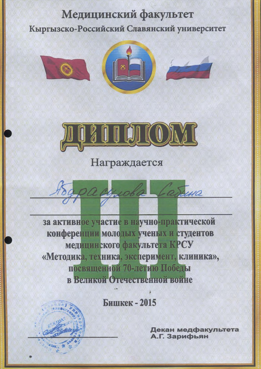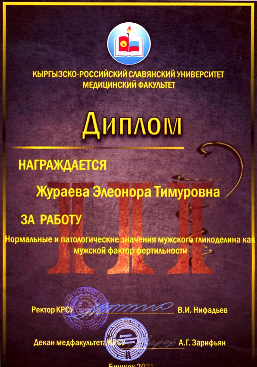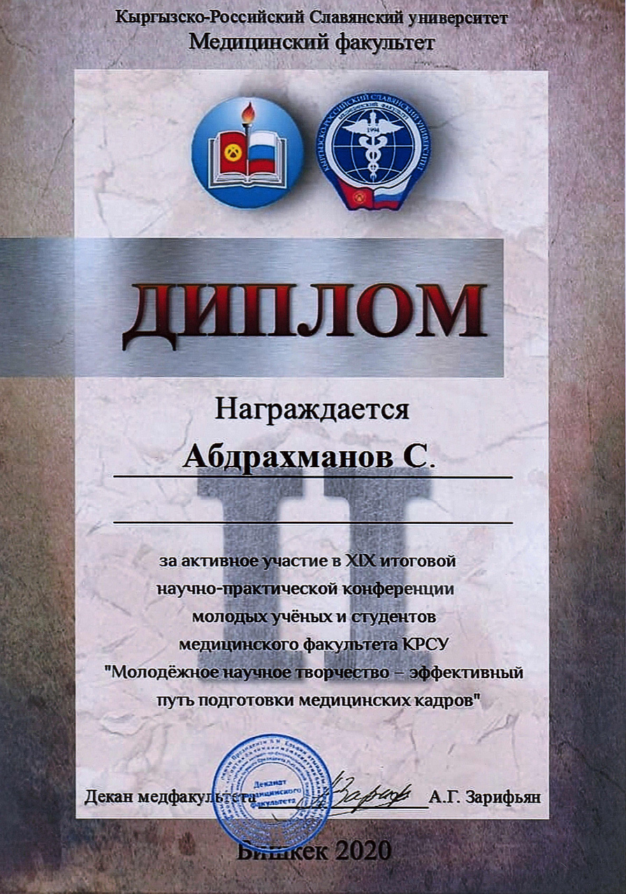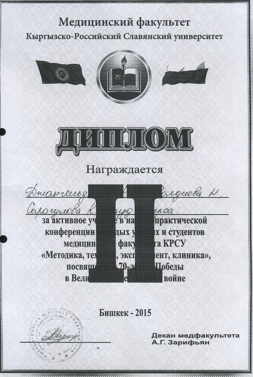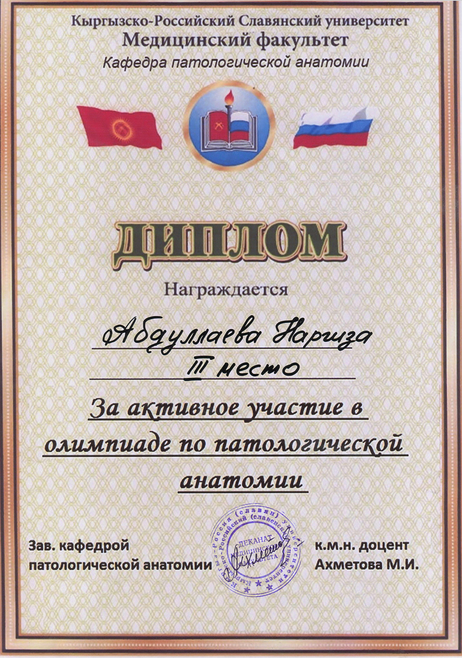 2. Исмаилова Р.Т., Омурбекова А.Н., Сыдыкова Н.Э.- диплом III степени " XXI ежегодной итоговой международной научно-практической конференции молодых ученых и студентов медицинского факультета Кыргызско-Российского Славянского университета имени первого Президента Российской Федерации Б.Н. Ельцина "Молодежное научное творчество - эффективный путь подготовки медико- биологических кадров". г. Бишкек 2022г.