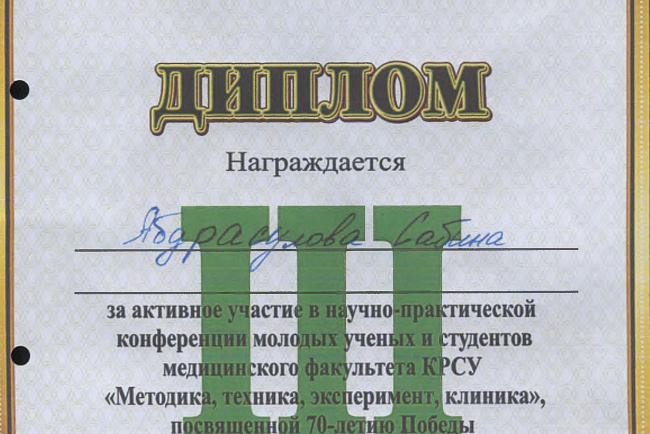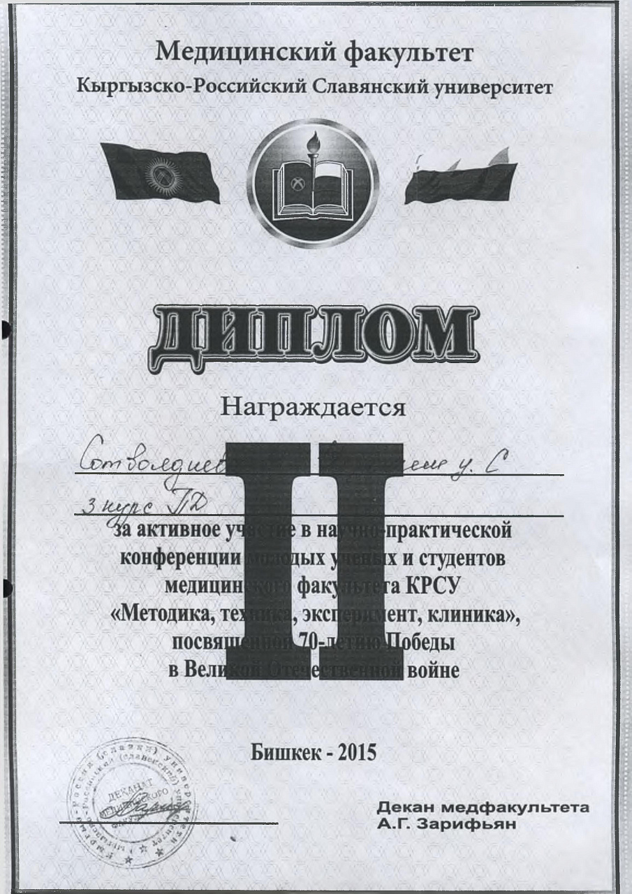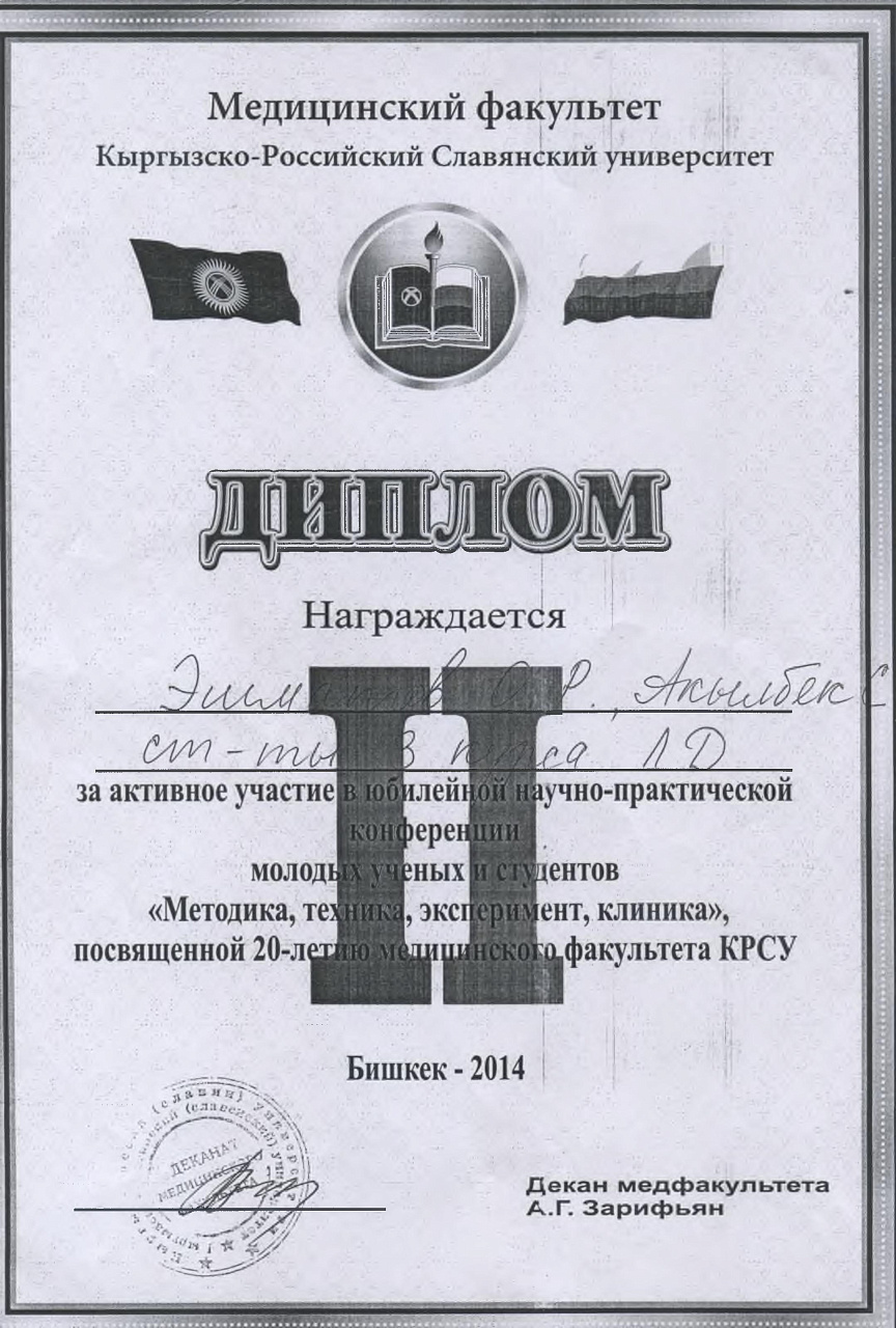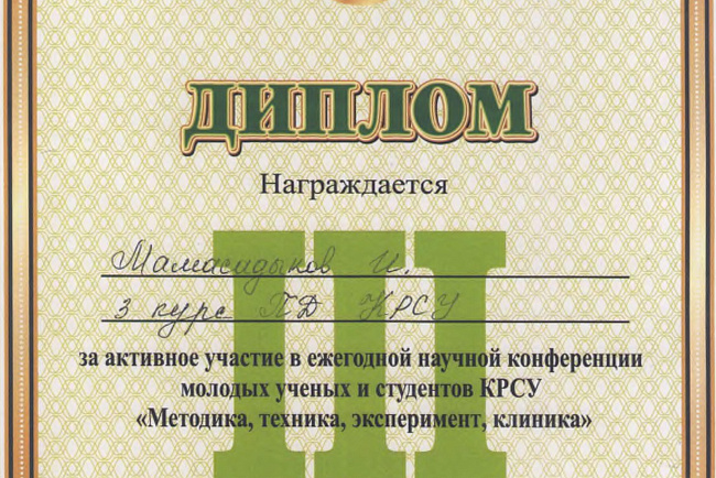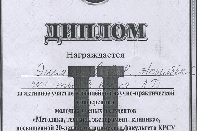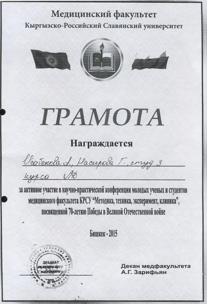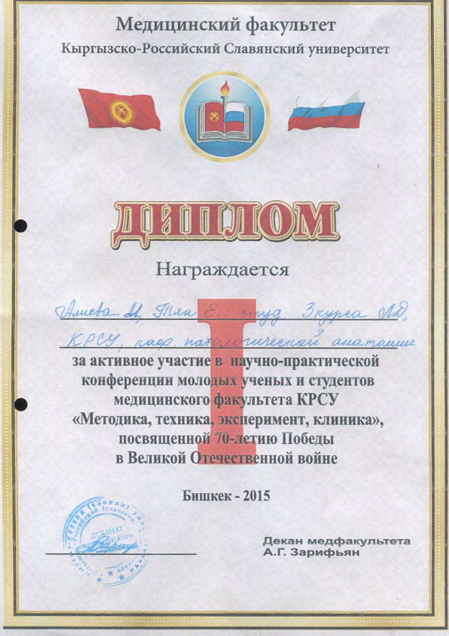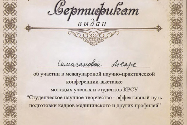 2. Исмаилова Р.Т., Омурбекова А.Н., Сыдыкова Н.Э.- диплом III степени " XXI ежегодной итоговой международной научно-практической конференции молодых ученых и студентов медицинского факультета Кыргызско-Российского Славянского университета имени первого Президента Российской Федерации Б.Н. Ельцина "Молодежное научное творчество - эффективный путь подготовки медико- биологических кадров". г. Бишкек 2022г.