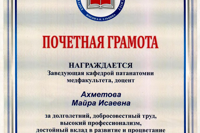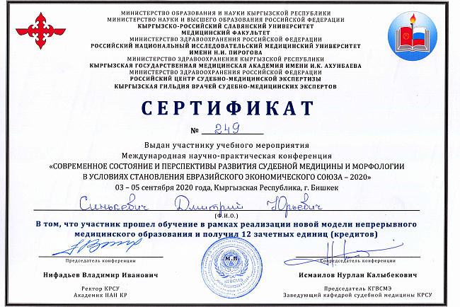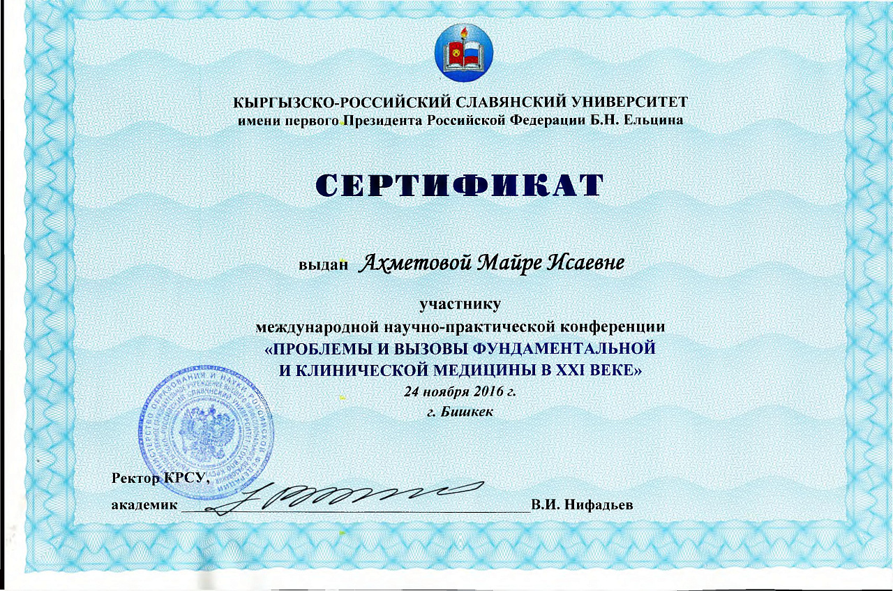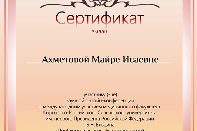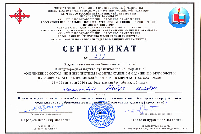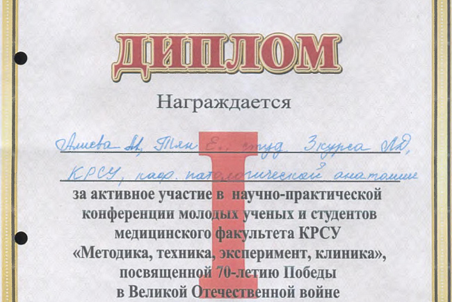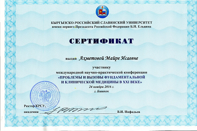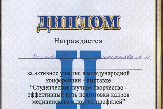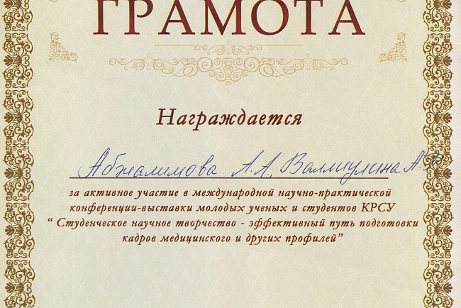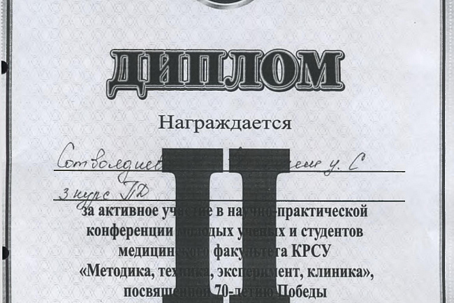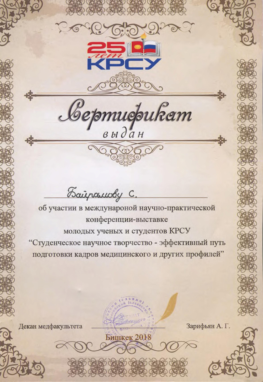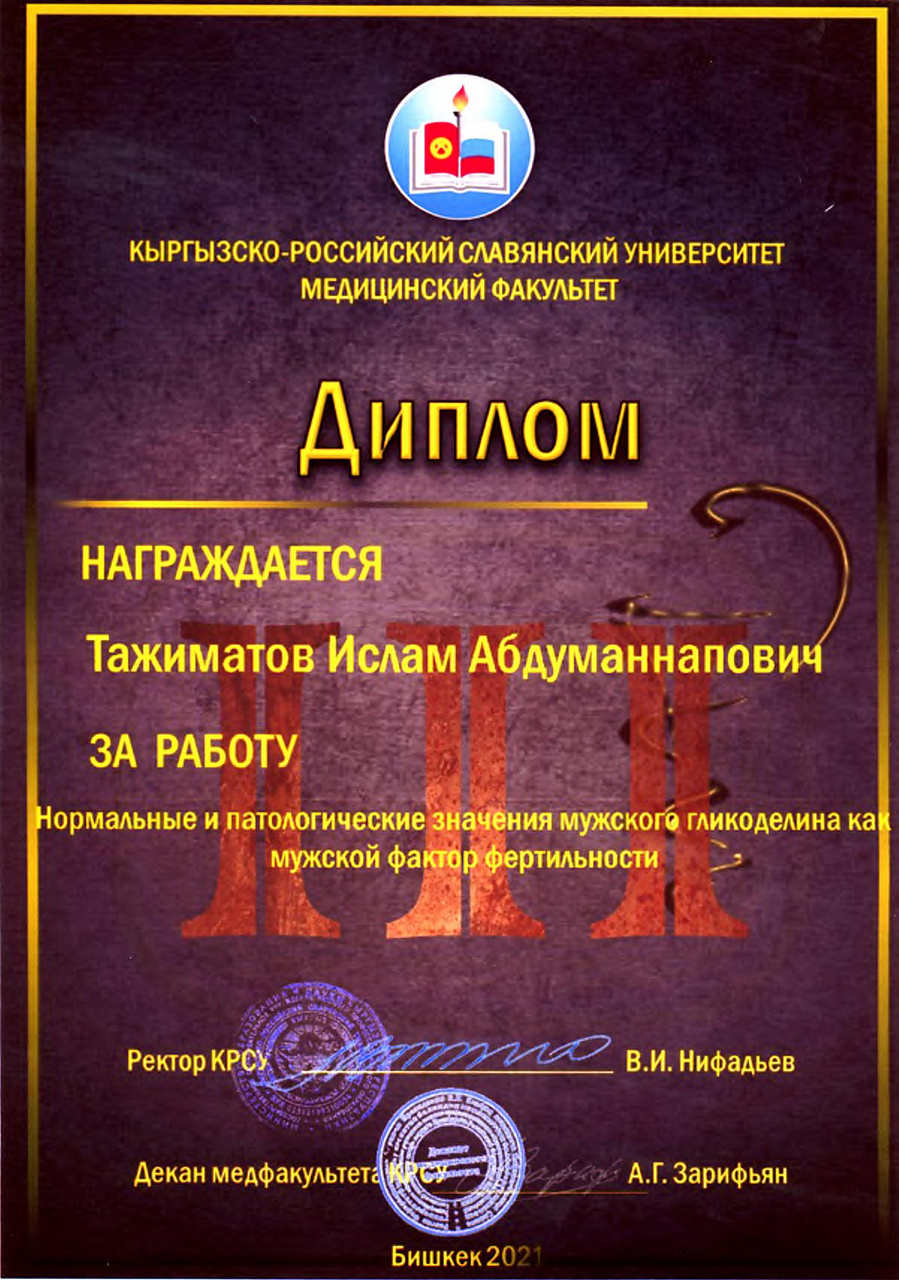 2. Исмаилова Р.Т., Омурбекова А.Н., Сыдыкова Н.Э.- диплом III степени " XXI ежегодной итоговой международной научно-практической конференции молодых ученых и студентов медицинского факультета Кыргызско-Российского Славянского университета имени первого Президента Российской Федерации Б.Н. Ельцина "Молодежное научное творчество - эффективный путь подготовки медико- биологических кадров". г. Бишкек 2022г.