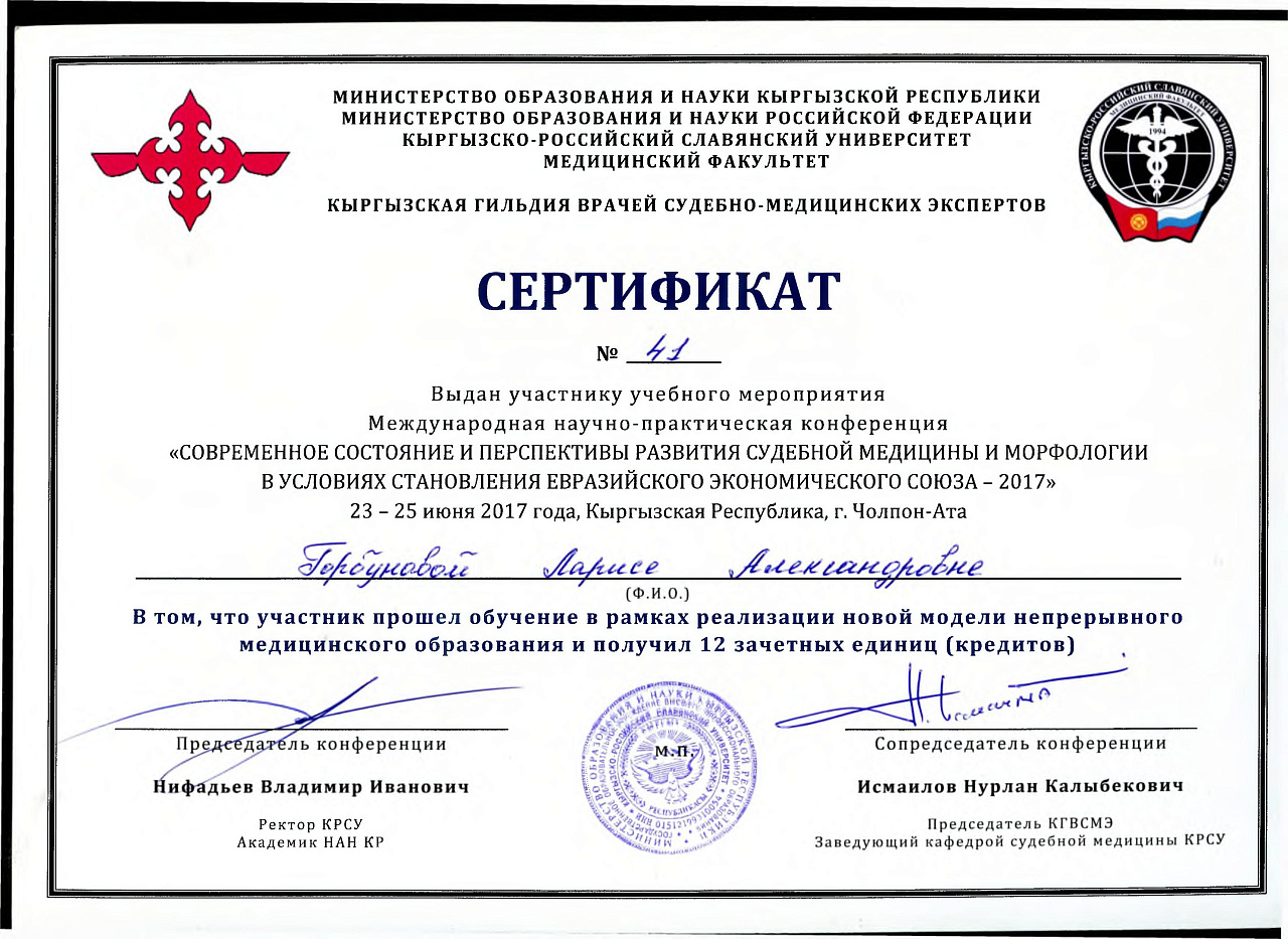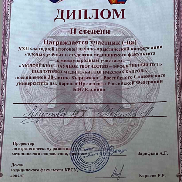 3. Мусаева Н.Г., Шевцова А. XXII ежегодная итоговая научно-практическая конференция молодых ученых и студентов медицинского факультета с международным участием " Молодежное научное творчество- эффективный путь подготовки медико- биологических кадров", посвященной 30-летию Кыргызско-Российского Славянского университета им. первого Президента Российской Федерации б.Н. Ельцина 19 мая 2023 г. Бишкек.-диплом II степени.