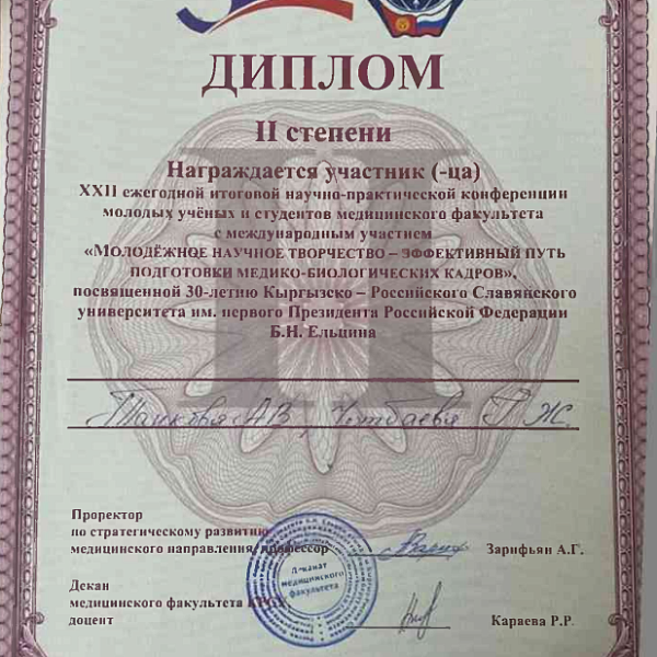 1. Танкова А.В., Чотбаева Г.Ж. XXII ежегодная итоговая научно-практическая конференция молодых ученых и студентов медицинского факультета с международным участием " Молодежное научное творчество- эффективный путь подготовки медико- биологических кадров", посвященной 30-летию Кыргызско-Российского Славянского университета им. первого Президента Российской Федерации б.Н. Ельцина 19 мая 2023 г. Бишкек.-диплом II степени.