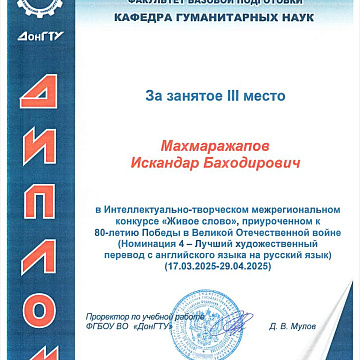 Студент КРСУ занял третье место в Интеллектуально-творческом межрегиональном конкурсе «Живое слово», приуроченном к 80-летию Победы в Великой Отечественной войне