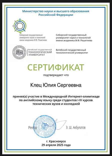 Студентка 2 курса Естественно-технического факультета группы ТТП-1-23 Клёц Юлия под руководством и. о. заведующей кафедры иностранных языков КРСУ Любимовой Натальи Александровны приняла участие в Международной Интернет-олимпиаде по английскому языку среди студентов I – IV курсов технических вузов и колледжей, организованной Кафедрой иностранного языка СибГУ им. М.Ф. Решетнева (г. Красноярск, Российская Федерация) совместно с кафедрой иностранных языков Витебского государственного технологического университета (г. Витебск, Республика Беларусь). По итогам Олимпиады Юля вошла в число победителей, удостоившись Диплома I степени.