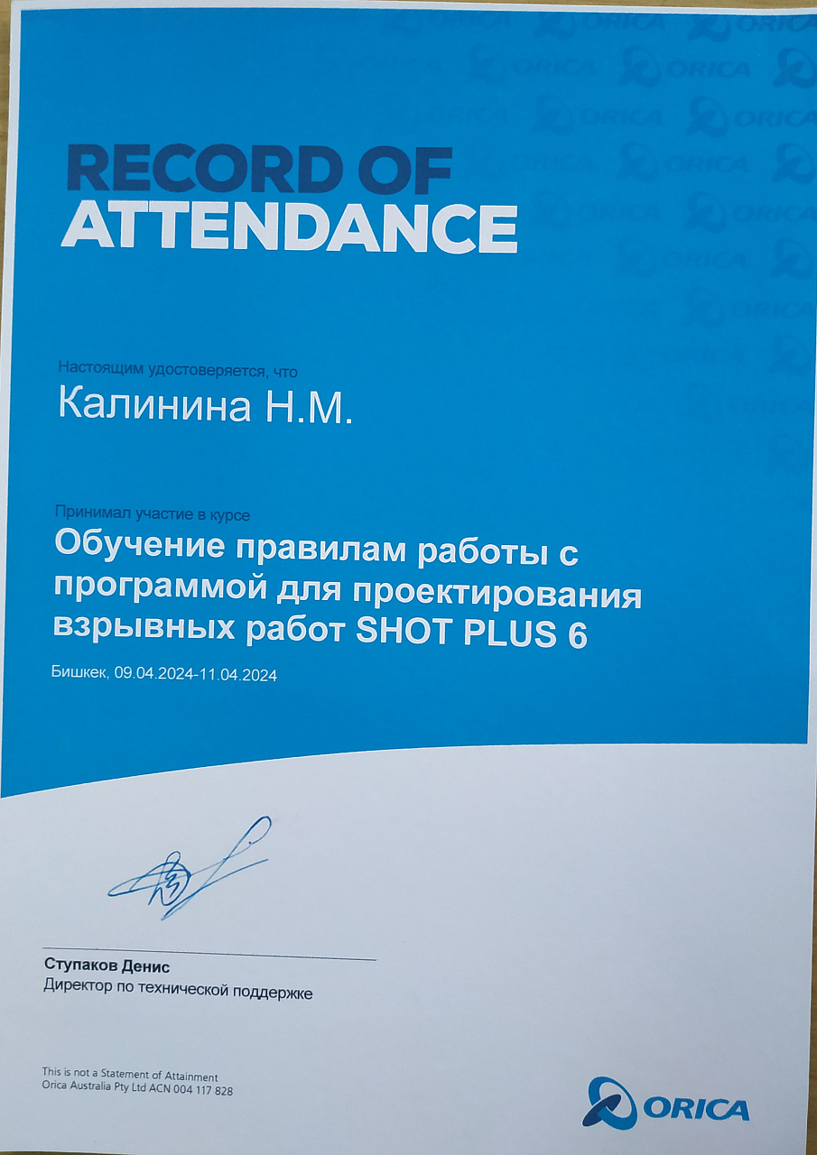 Калинина Н.М. принила участие в курсе "Обучение правилам работы с программой для проектирования взрывных работ SHOT PLUS 6" г. Бишкек с 09.04.2024 г. по 11.04.2024 г.