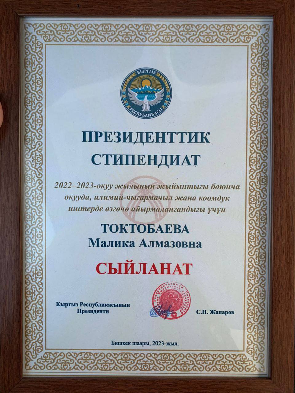 Токтобаева Малика (группа УМБ-1-20) в числе лучших студентов КРСУ. Садыр Жапаров вручил президентские стипендии 75 лучшим студентам республики. Глава республики отметил успехи в образовании, вручив особый сертификат на президентскую стипендию в размере 60 тысяч сомов.
