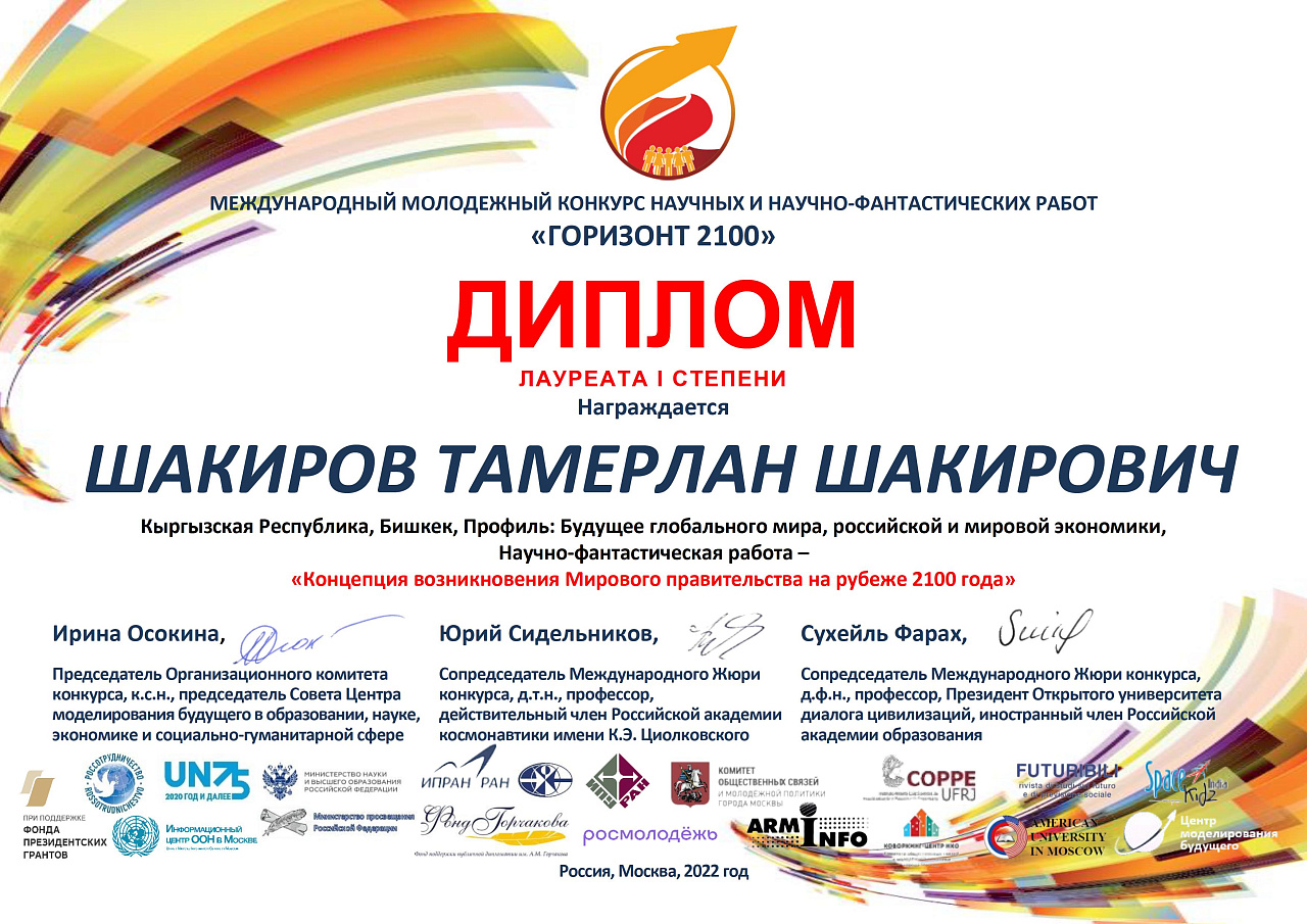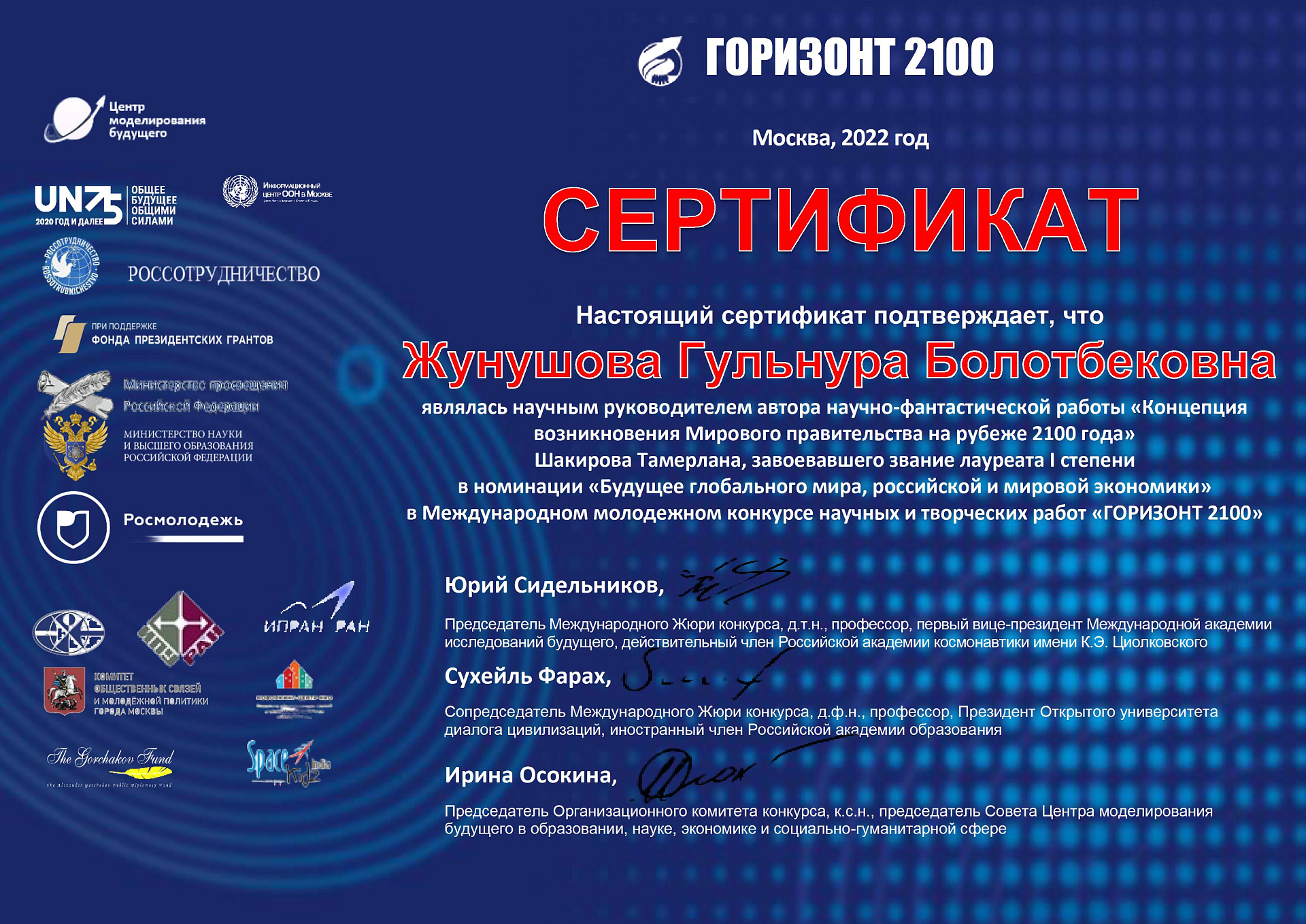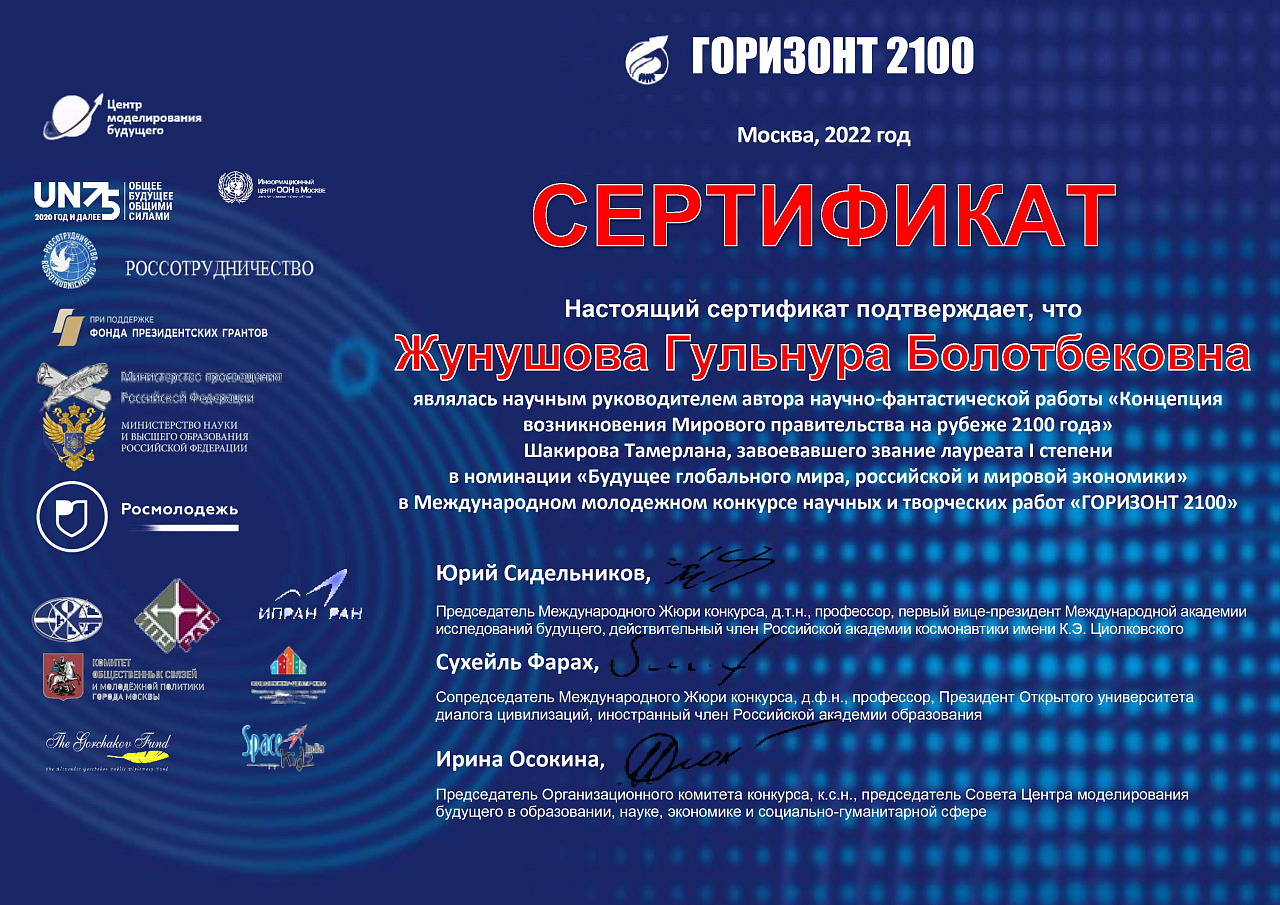2.Жунушова Гульнура Болотбековна-награждена сертификатом научного руководителя автора научно-фантастической работы "Концепция возникновения Мирового правительства на рубеже 2100 года" Шакирова Тамерлана Шакировича, (сертификат).