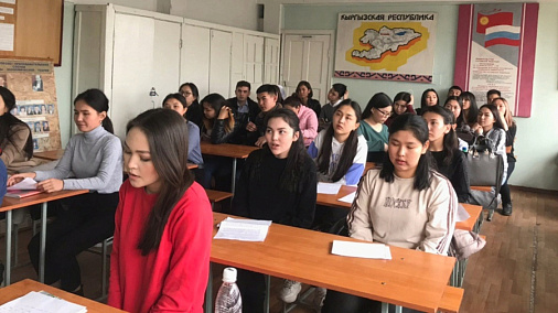 5 марта 2020 года на базе экономического факультета КРСУ ст. преподаватель кафедры иностранных языков Г. Пряникова провела урок на английском языке «All flags are welcome», приуроченный ко дню флага Кыргызской Республики.