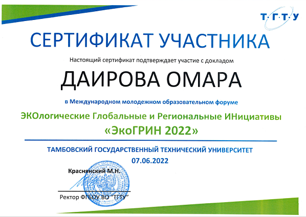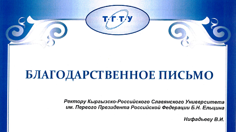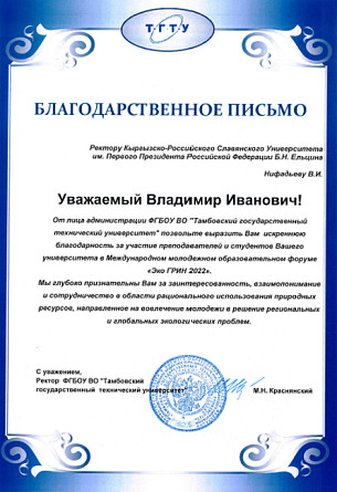 Ректорат Тамбовского государственного технического университета поблагодарил ректора КРСУ, академика Владимира Нифадьева за участие преподавателей и студентов вуза в Международном молодежном образовательном форуме «Эко ГРИН-2022».
