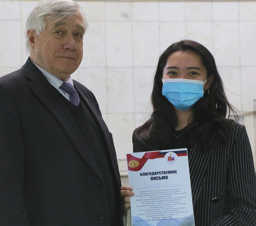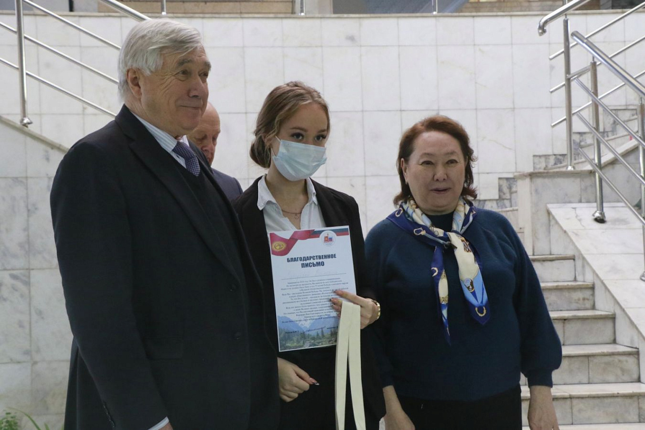 Ректор университета, академик Владимир Нифадьев вручил благодарственные письма кандидату юридических наук, преподавателю юридического факультета Насибе Эшмурадовой и студентам – Нагиме Асановой (Ю-5-18), Руслану Атаеву (Ю-6-18), Айбеку Коеналиеву (Ю-5-18), Чолпон Мамбетовой (Ю-6-18), Айгерим Сыдыковой (Ю-6-18), Эмир уулу Усенбеку (Ю-5-18), Эльзару Эдуарду (Ю-5-18) и Валерии Зубаревой (ГФ-2-20).