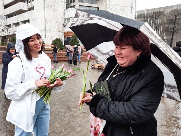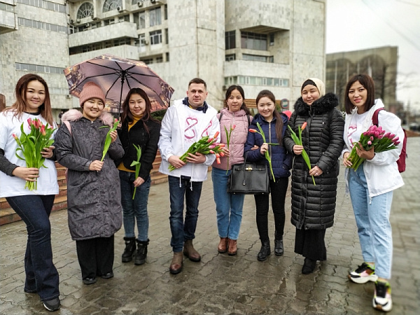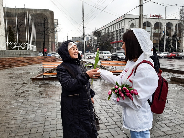 В акции приняли участие члены Future Team Kyrgyzstan и студенты КРСУ. Свыше 200 женщин получили поздравления и приятные подарки.