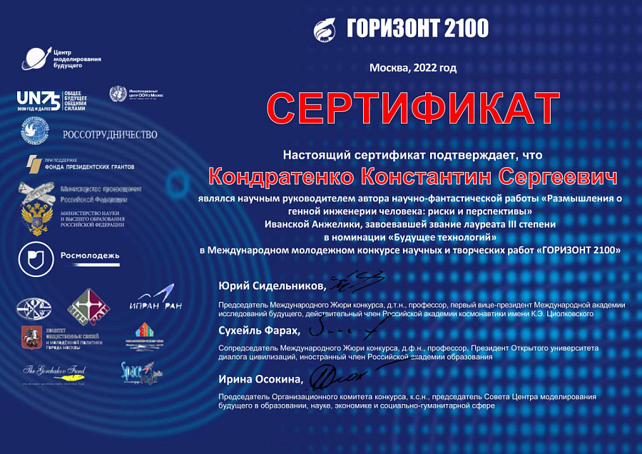 Кроме того, в декабре 2022 года студентка А. Иванская заняла 3 место на Международном молодежном конкурсе «Горизонт 2010»’22. Молодая писательница завоевала призовое место в номинации «Научно-фантастические работы». Тема ее конкурсного эссе – «Размышления о генной инженерии человека: риски и перспективы». Научным руководителем бронзового призера конкурса выступил руководитель «Писательской мастерской "Эхо Атлантиды"» Константин Кондратенко, в адрес которого на днях пришел соответствующий сертификат от организаторов масштабного конкурса.