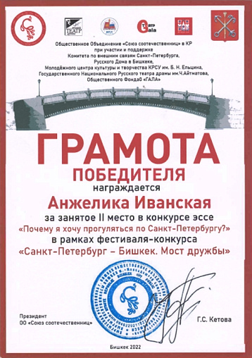 Напомним, что призовые места в конкурсе эссе в рамках фестиваля-конкурса «Санкт-Петербург – Бишкек. Мост дружбы» завоевали студенты гуманитарного факультета КРСУ – участники творческой студии «Писательская мастерская "Эхо Атлантиды"» Батыр Койчуев (1 место) и Анжелика Иванская (2 место).
