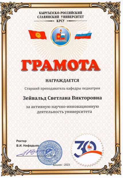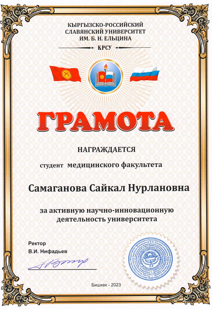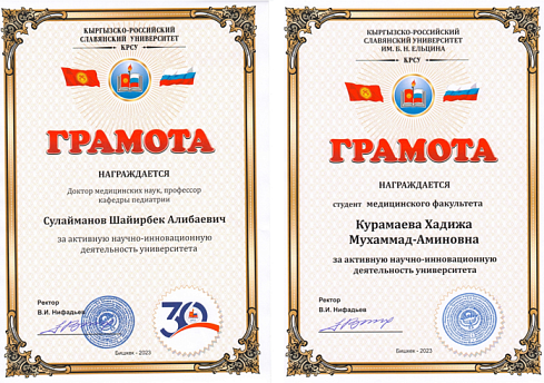 За лучшие статьи в наукометрических базах данных награждён премией в 5000 сомов заведующий кафедрой терапии №2 специальности «Лечебное дело», профессор Ибрагим Сабиров.