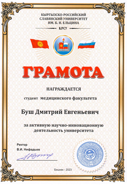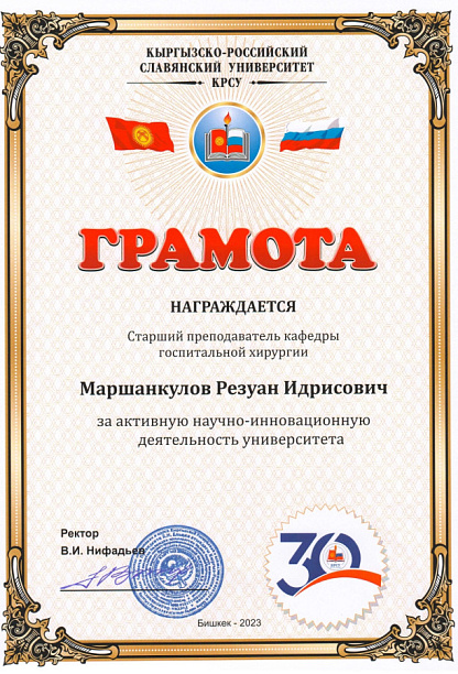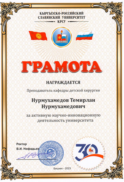 Поощрен из Фонда науки КРСУ денежной премией в сумме 5000 сомов за победу в конкурсе «Лучшая монография КРСУ» по итогам 2022 года с вручением Диплома: Эмил Макимбетов, профессор кафедры онкологии и лучевой терапии.