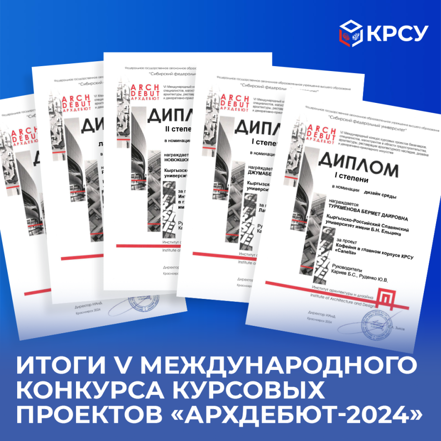 - Туркменова Б.Д. получила Диплом I степени за проект «Кофейня в главном корпусе КРСУ».
