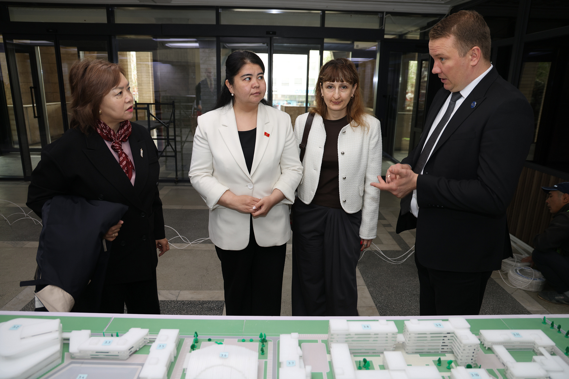 В рамках визита в университет депутат Жогорку Кенеша Кыргызской Республики, выпускница КРСУ Нилуфар Алимжанова и судья Конституционного суда Кыргызской Республики Чынара Айдарбекова ознакомились с инфраструктурой вуза и школы. Гости посетили обновлённые аудитории, современные образовательные пространства и лаборатории, а также получили представление об организации учебного процесса и возможностях для подготовки специалистов и школьников.