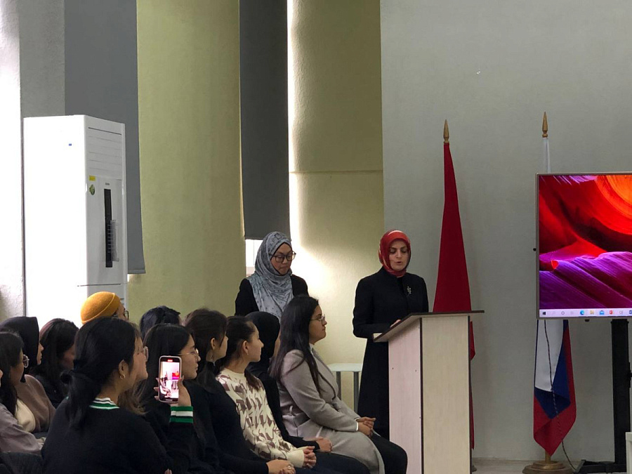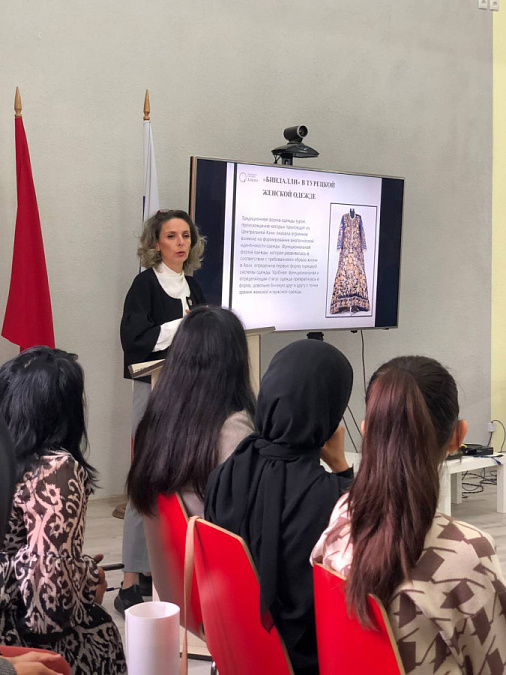 После приветственных слов организаторов и гостей с докладом на тему «Биндалли» выступила Севги Балтажы. Ее коллега, Асуман Ышинер, познакомила студентов с турецкими свадебными обычаями, рассказала о технологии по созданию национальных женских свадебных нарядов.