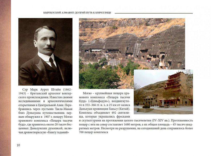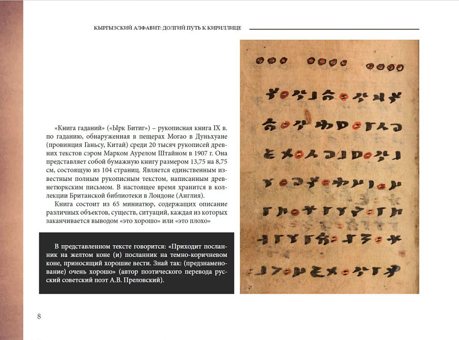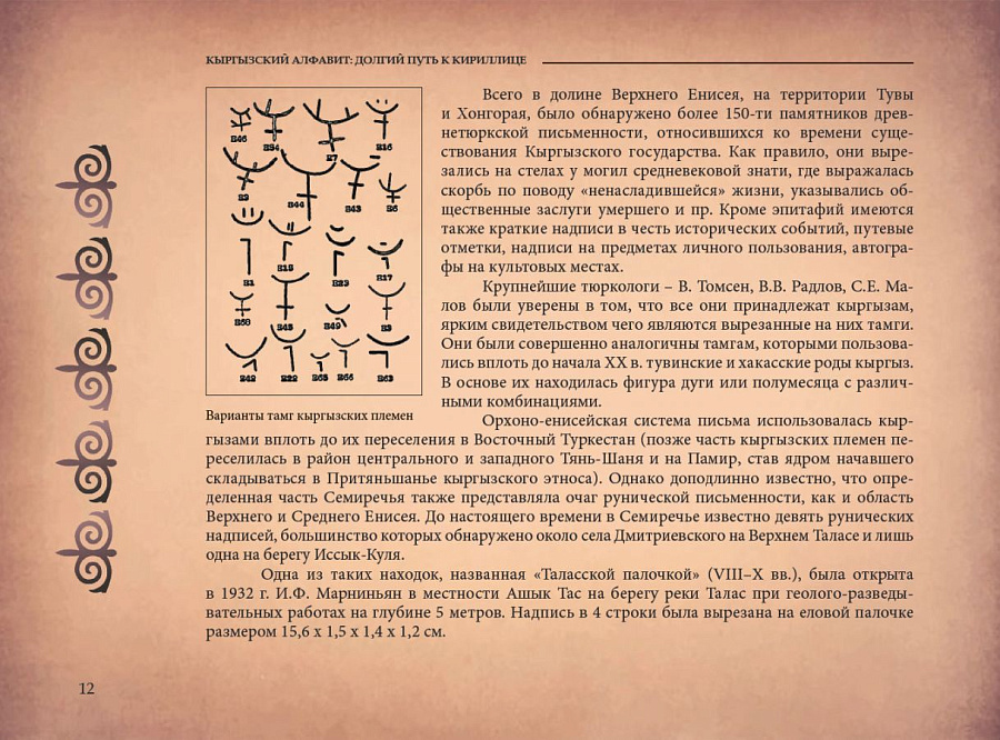 Структура представленной работы – документальные материалы и фотографии, сопровождающиеся небольшими историческими очерками, – позволит читателям не только визуализировать исторические факты, но и погрузиться в раскрывающиеся на основе методологии интеллектуальной истории исторические и культурные контексты алфавитного строительства, характеризовавшиеся интенсивностью цивилизационного диалога и обмена идеями. В их центре такие выдающиеся исторические личности, как автор «Собрания тюркских языков» Махмуд ал-Кашгари; основатель чагатайского языка, сын Чингисхана Чагатай; авторы первых печатных изданий на кыргызском языке Осмоналы Сыдыков, Молдо Кылыч и Молдо Нияз; авторы идеи разработки национального алфавита для кыргызского языка на основе кириллицы востоковед Николай Иванович Ильминский, министр народного просвещения Российской империи Дмитрий Андреевич Толстой, первый туркестанский генерал-губернатор Константин Петрович фон Кауфман; составитель одного из первых учебников по кыргызскому языку, в которых к кыргызским словам была применена модифицированная кириллица, ориенталист, изобретатель, генерал-майор Михаил Африканович Терентьев; один из реформаторов арабского алфавита, кыргызский языковед Ишеналы Арабаев; идеолог латинизации кыргызского алфавита, кыргызский ученый и государственный деятель Касым Тыныстанов; выдающийся советский лексикограф, участник всех алфавитных реформ, проводившихся в советский период, один из авторов кыргызской орфографии, «отец» кыргызских Өө и Үү Константин Кузьмич Юдахин и, конечно же, кыргызский народ.