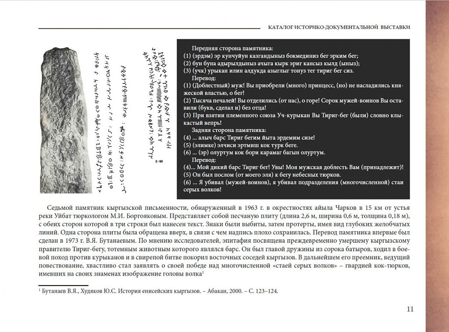 По мнению автора-составителя историко-документального каталога, принятый в 1941 году Киргизской ССР кириллический алфавит, прекрасно отображающий фонетические особенности кыргызской речи, дал ощутимый толчок развитию кыргызского литературного языка, на протяжении 80 лет доказывая свое удобство и простоту. Кроме того, русская графика открыла кыргызской молодежи возможность беспрепятственно осваивать русский язык, а через него знакомиться с достижениями русской и мировой науки и культуры, творчески переосмысливая их и вплетая в канву национальной культуры.
