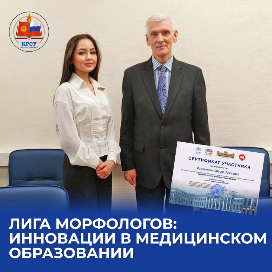 В программу конференции, был включен доклад студентки 6 курса (ЛД-9-18) медицинского факультета КРСУ Исраиловой Фирузы «Лига Морфологов – приложение для студентов медицинских вузов» (Научный руководитель - к.м.н., доцент Бейсембаев А.А.). Необходимо отметить, что доклад Исраиловой Ф. был единственным студенческим в программе и выступление получило положительный отзыв от модераторов и участников конференции, в частности от Завьялова А.И., д.м.н., ведущего научного сотрудника отдела Российского музея медицины ФГБНУ, Национального НИИ общественного здоровья имени Н.А. Семашко, Григорьян Я.Г. к.и.н., доцента института социальных наук Сеченовского университета. В результате обсуждения доклада были установлены научные контакты с исследователями из Сеченовского университета, которые выразили желание сотрудничать с КРСУ им. Б.Н. Ельцина.