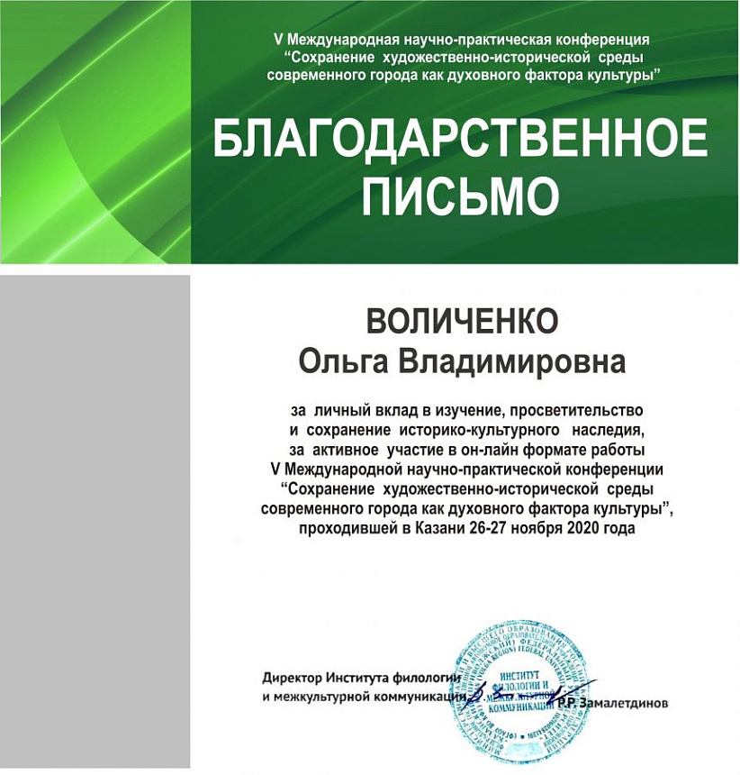 Сотрудники нашей кафедры – профессор Ольга Воличенко, доценты Бейсен Кариев и Юлия Руденко – получили благодарственные письма Международной конференции с формулировкой «За личный вклад в архитектурное образование, сохранение историко-культурного наследия, за успешную работу в онлайн-формате».