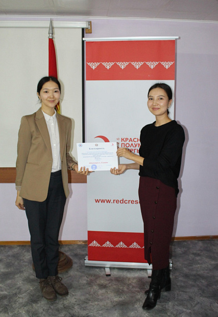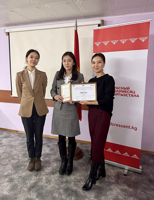Диплом I степени, сертификат от книжного магазина «Раритет» на сумму 2000 сомов, учебник по МГП – студенты юридического факультета КРСУ М. Максатова (тема доклада: «Роль Международного Комитета Красного Креста в развитии международного гуманитарного права») и Б. Сулкайдарова (тема сообщения: «Кибервойна как вызов международному гуманитарному праву»).