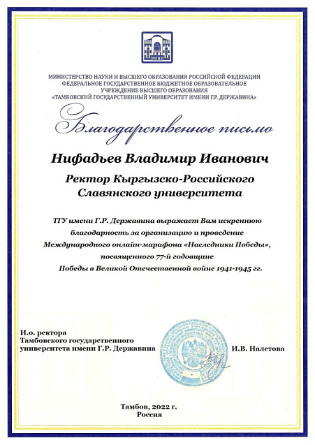 Сотрудники Тамбовского государственного университета имени Г. Державина выразили благодарность Кыргызско-Российскому Славянскому университету за участие в Международном онлайн-марафоне «Наследники Победы», посвященном Великой Отечественной войне.
