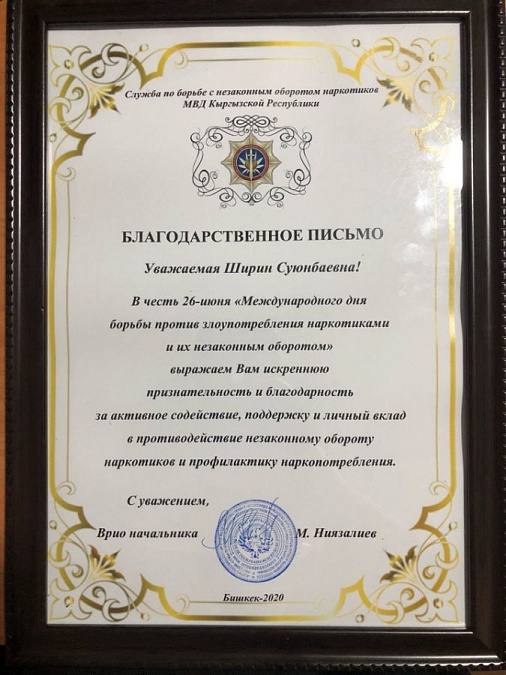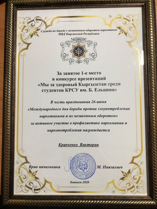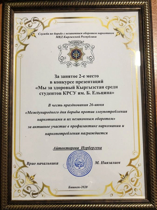26 августа в Бишкеке в рамках проведенной профилактической акции «Мы за здоровый Кыргызстан» состоялась церемония награждения победителей онлайн-конкурса среди студентов КРСУ на лучшую презентацию в сфере наркопрофилактики.